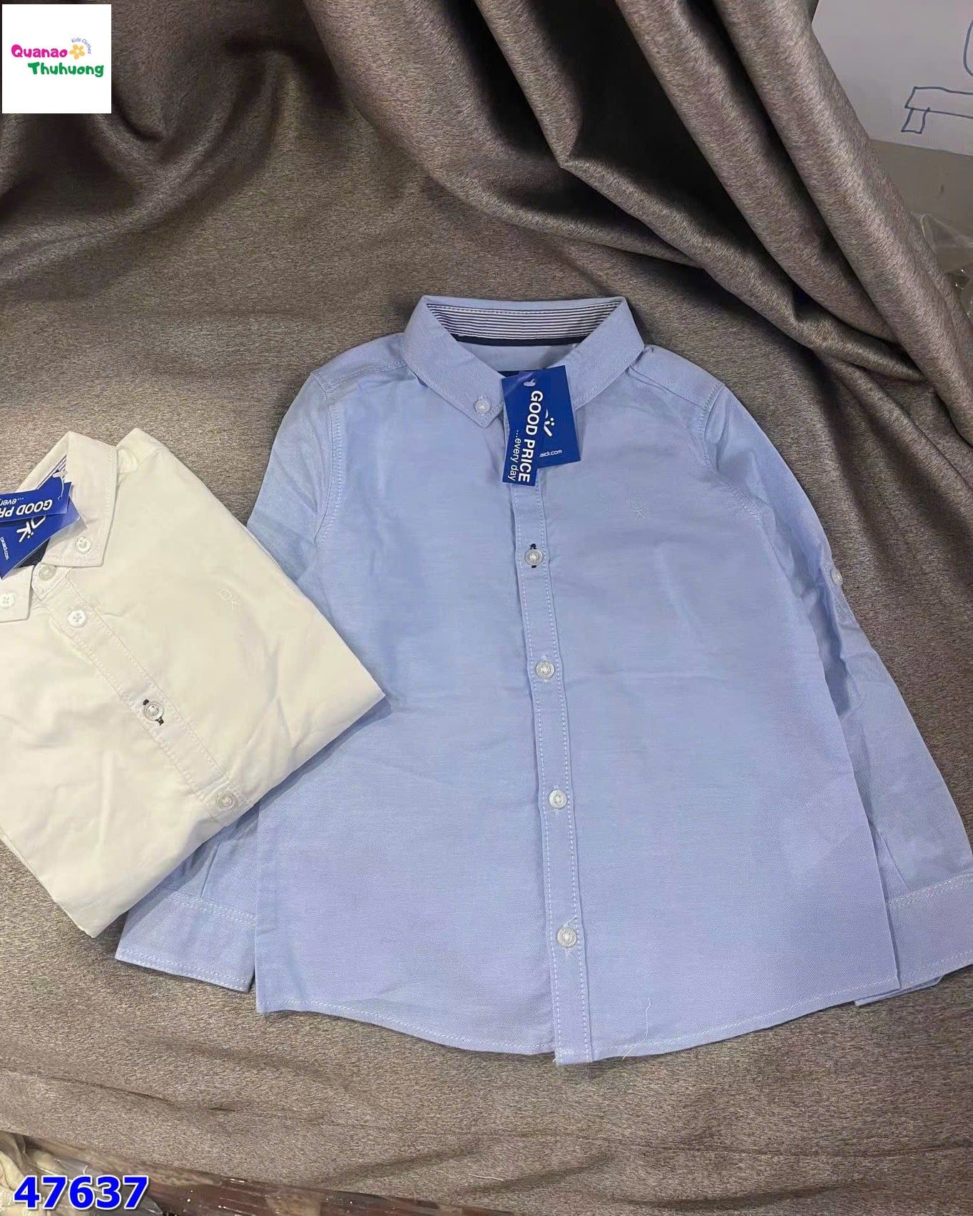 Áo sơ mi Okadi tông xanh trang nhã, thiết kế dài tay lịch sự giúp bé trông chỉn chu và sáng gương mặt