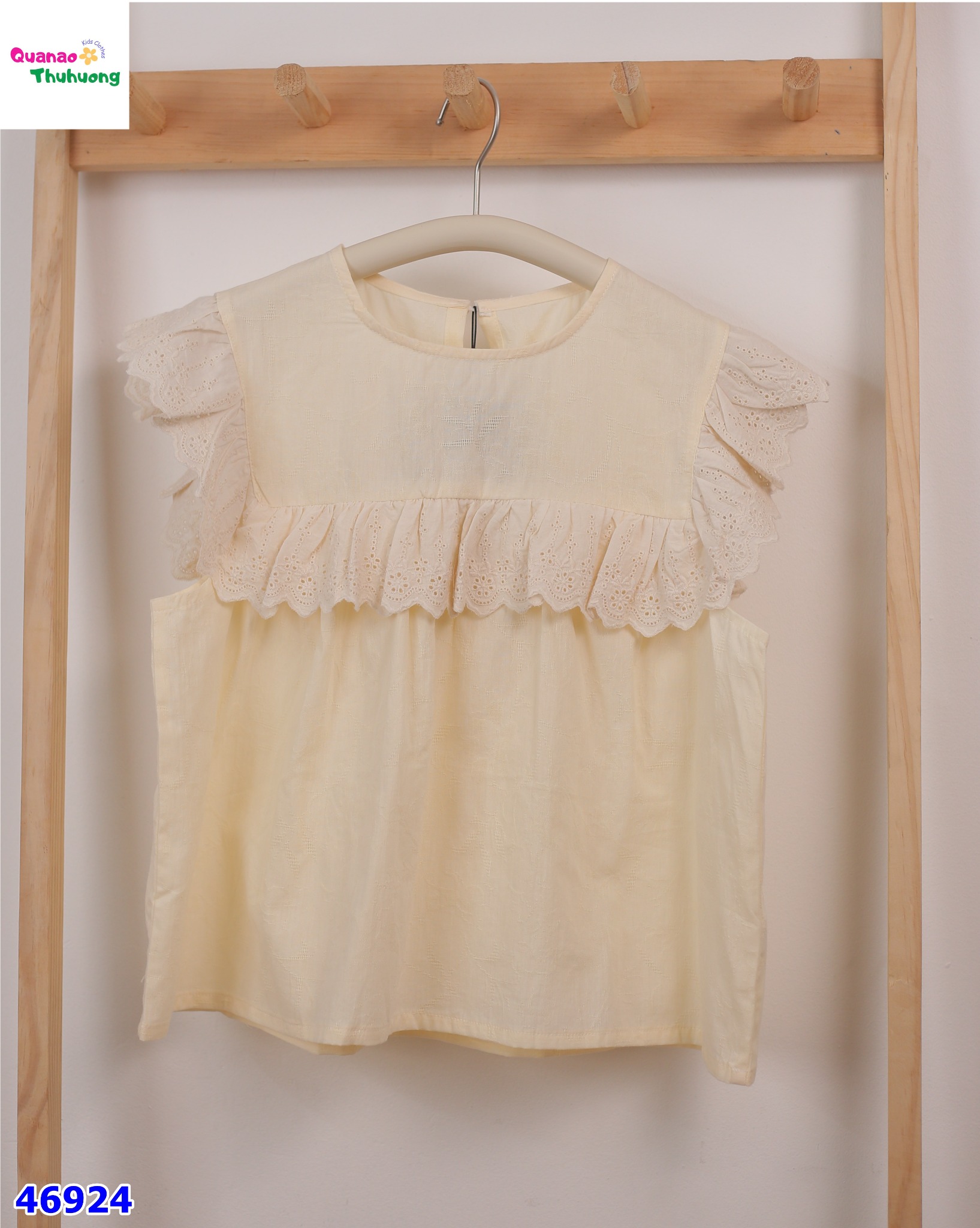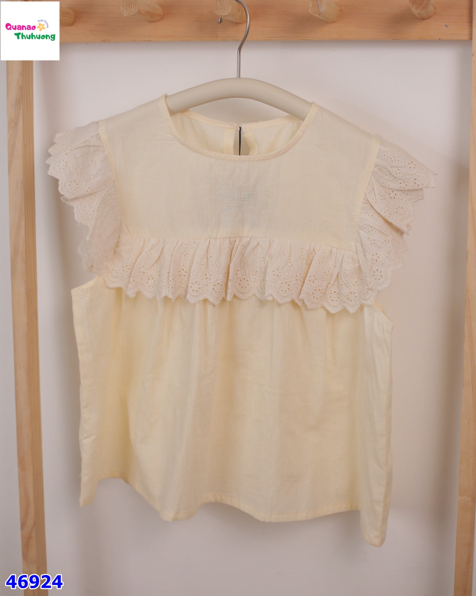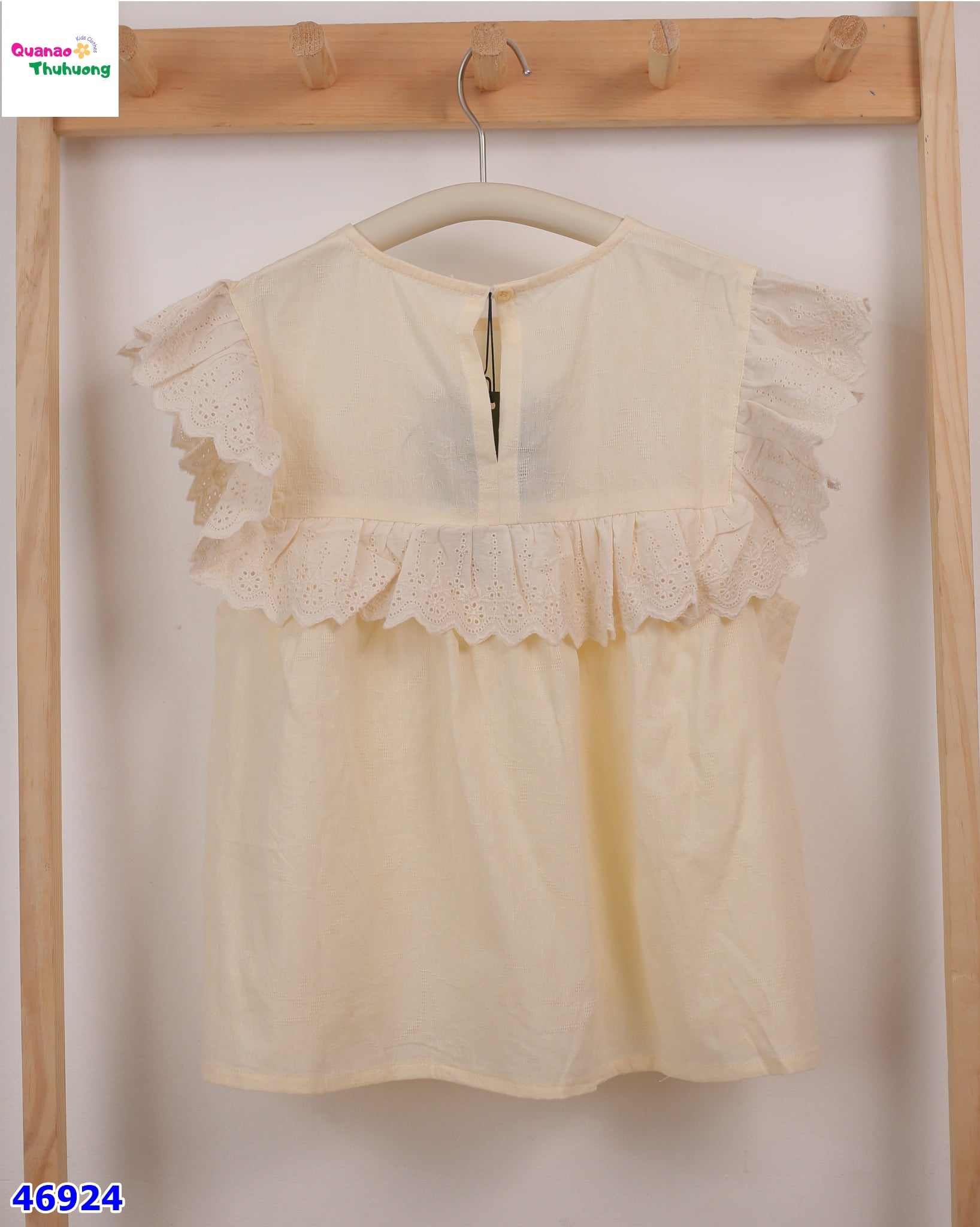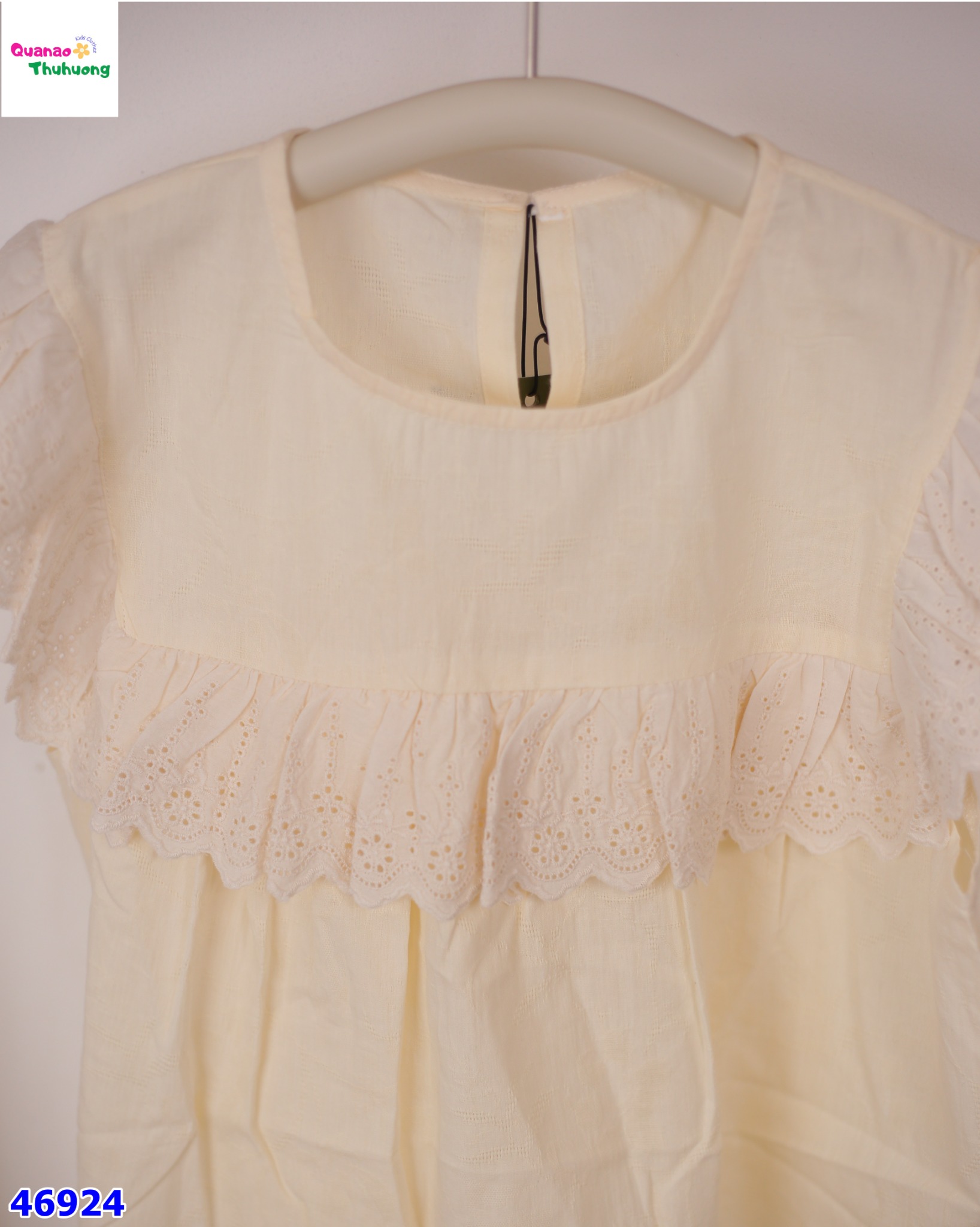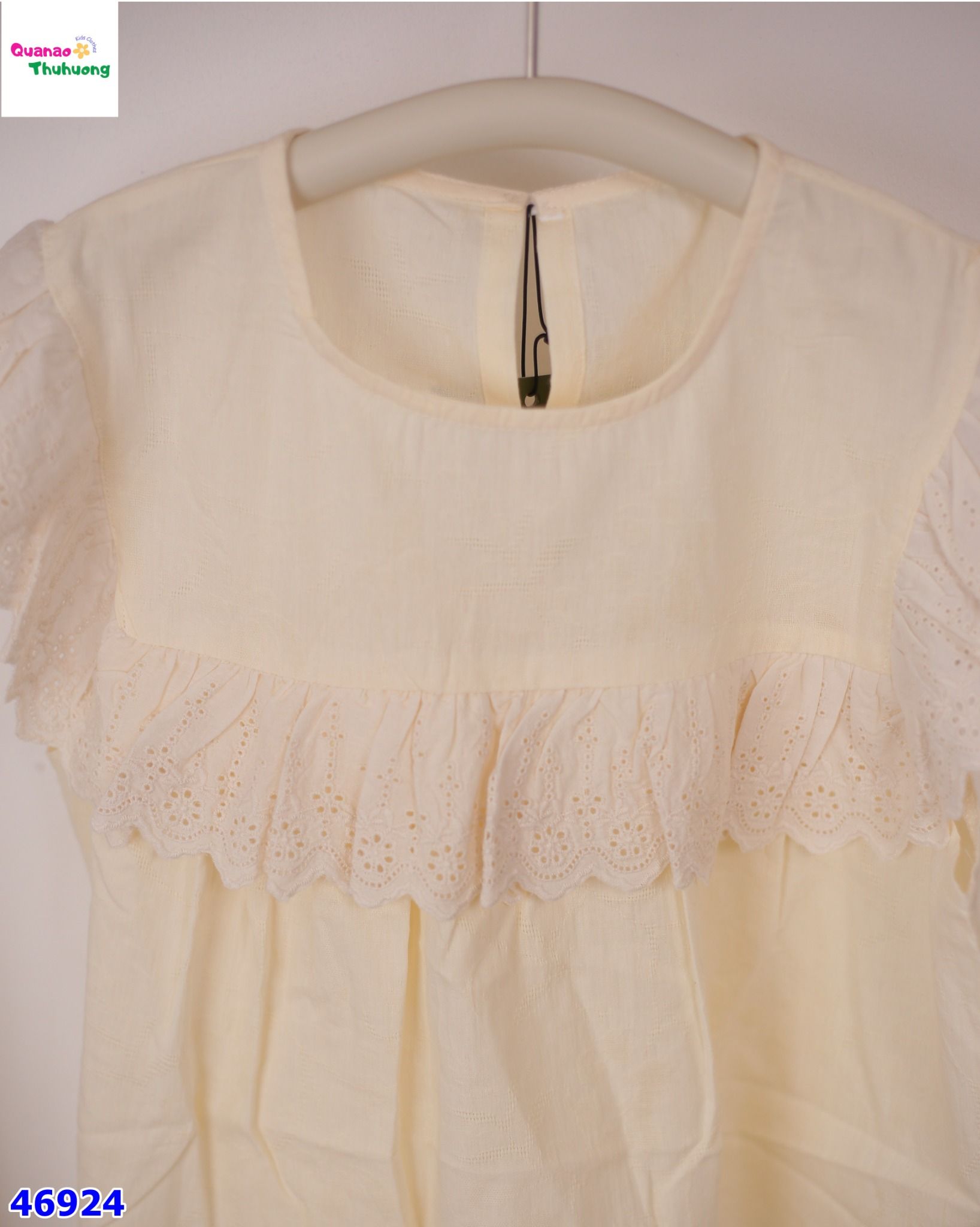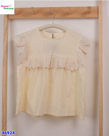 - Áo Cánh tiên màu vàng, thiết kế cổ tròn, bèo ren trước ngực xinh xắn dễ thương.