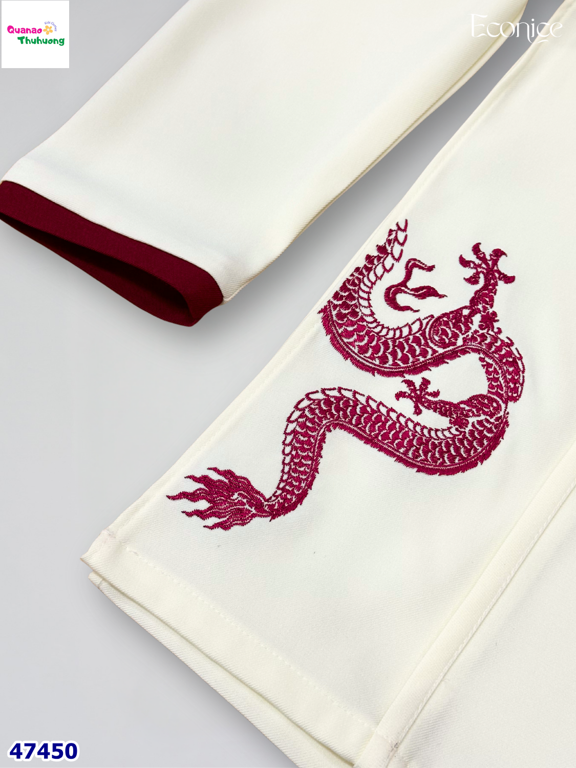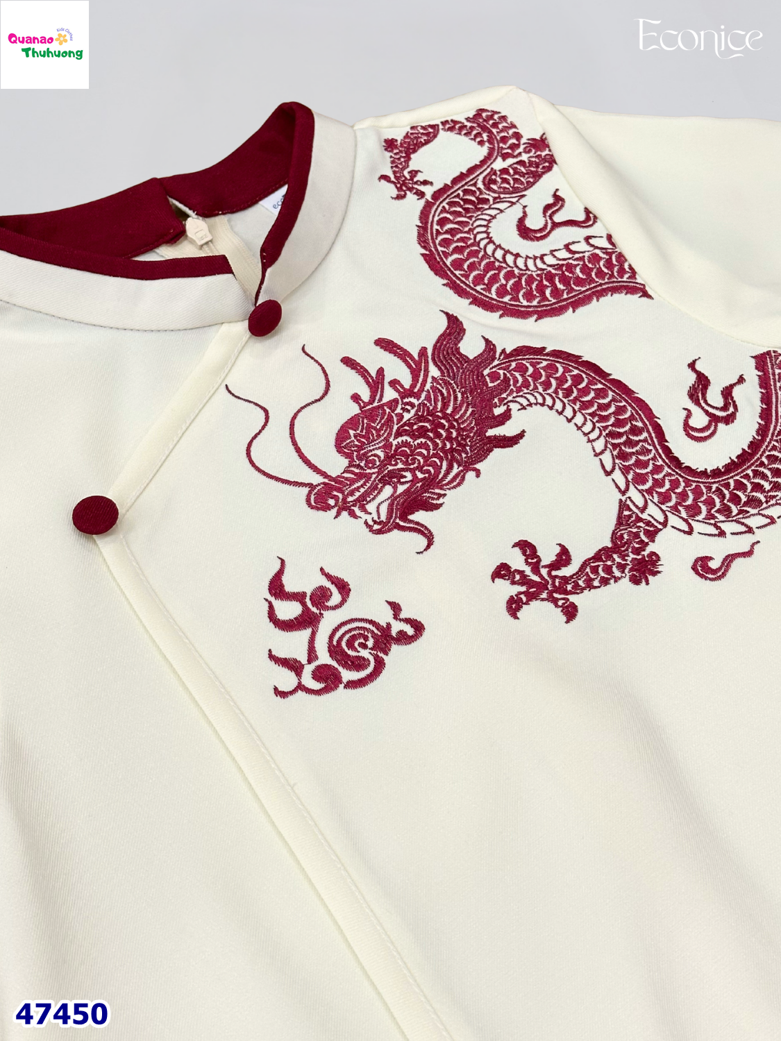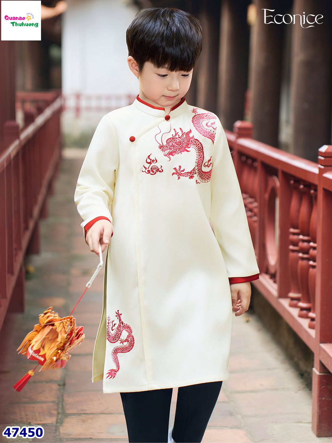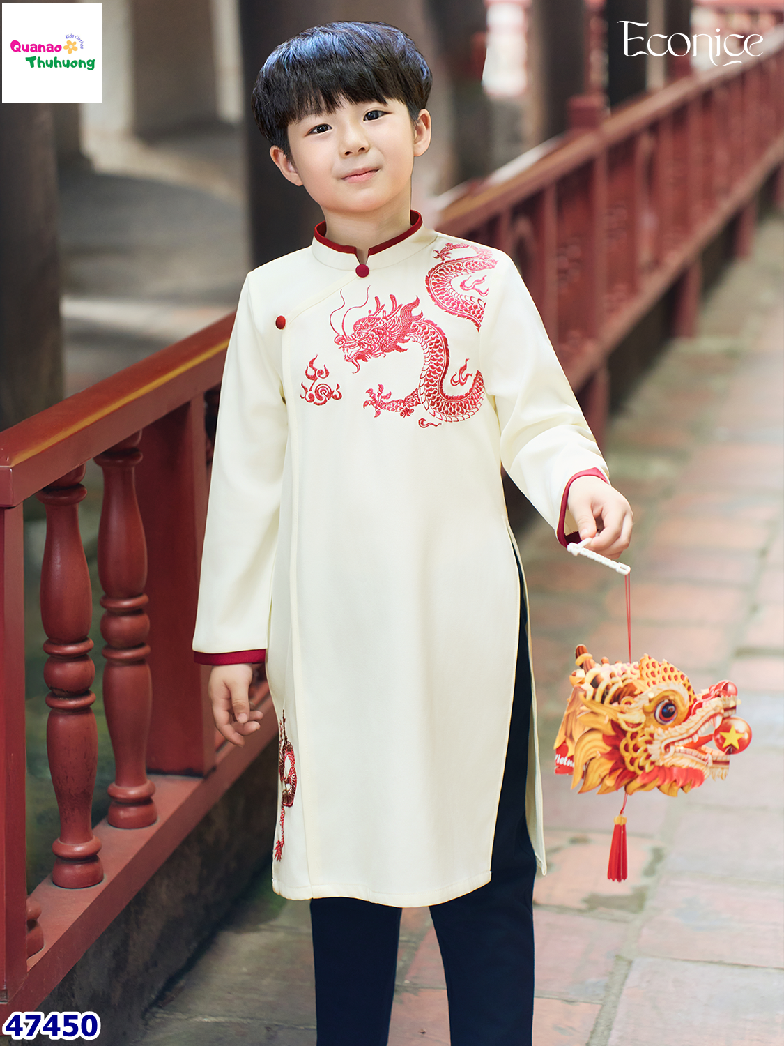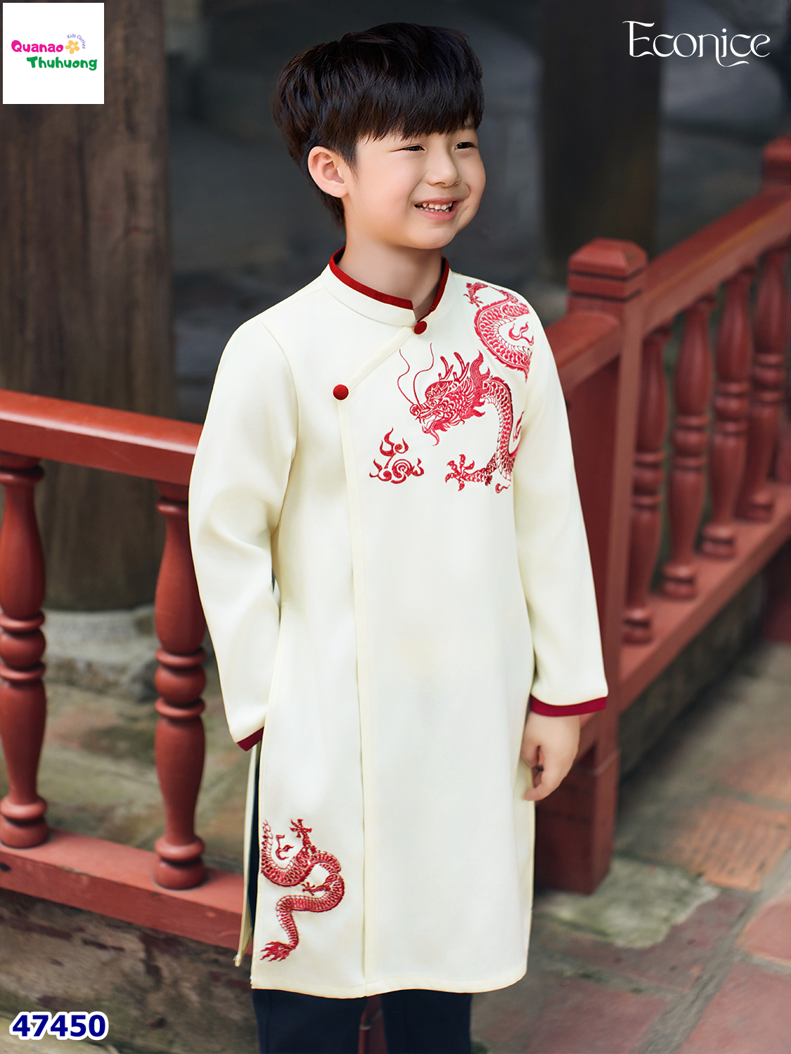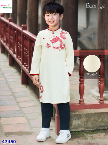 Áo dài trắng tinh khôi, điểm họa tiết rồng quyền uy trên ngực và tà áo, tôn vẻ lịch lãm cho bé trai.