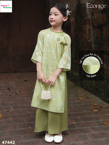 Thiết kế cách tân nhẹ nhàng với tà dài và cổ truyền, màu xanh lá nổi bật mang đến vẻ tươi mát, dễ phối cùng phụ kiện cho bé gái.
