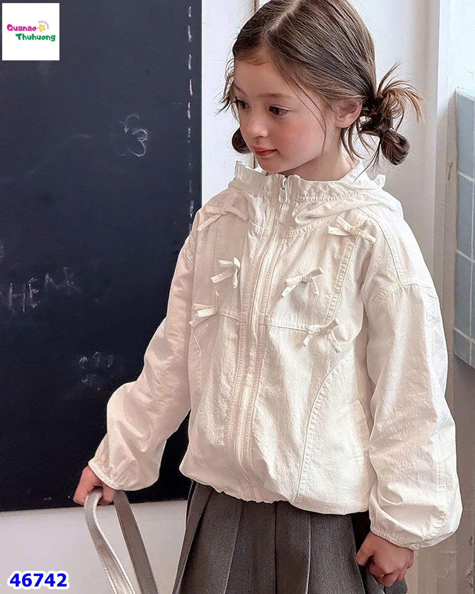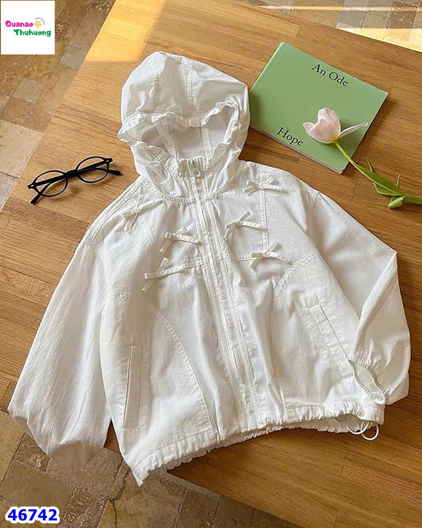 - Thiết kế áo khoác có nón 2 lớp đính phụ kiện nơ siêu Hot, phối dây rút điều chỉnh độ vừa vặn, tạo nên sự tinh tế.