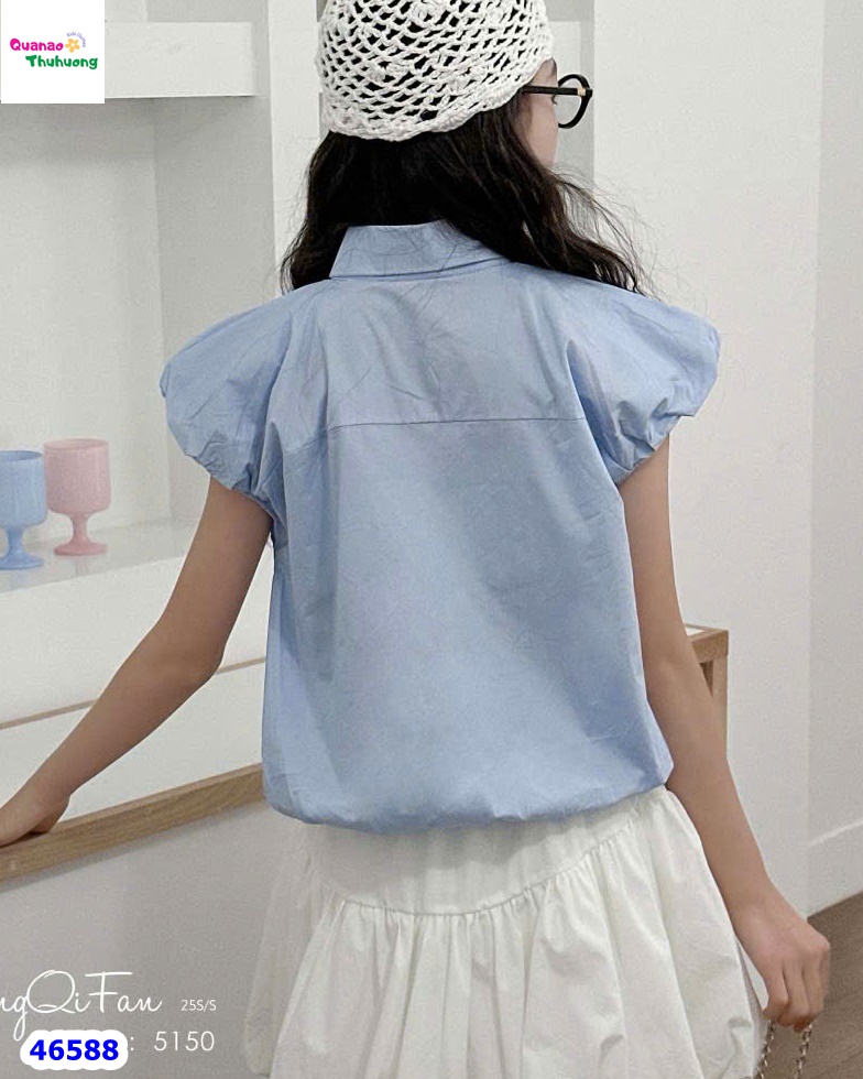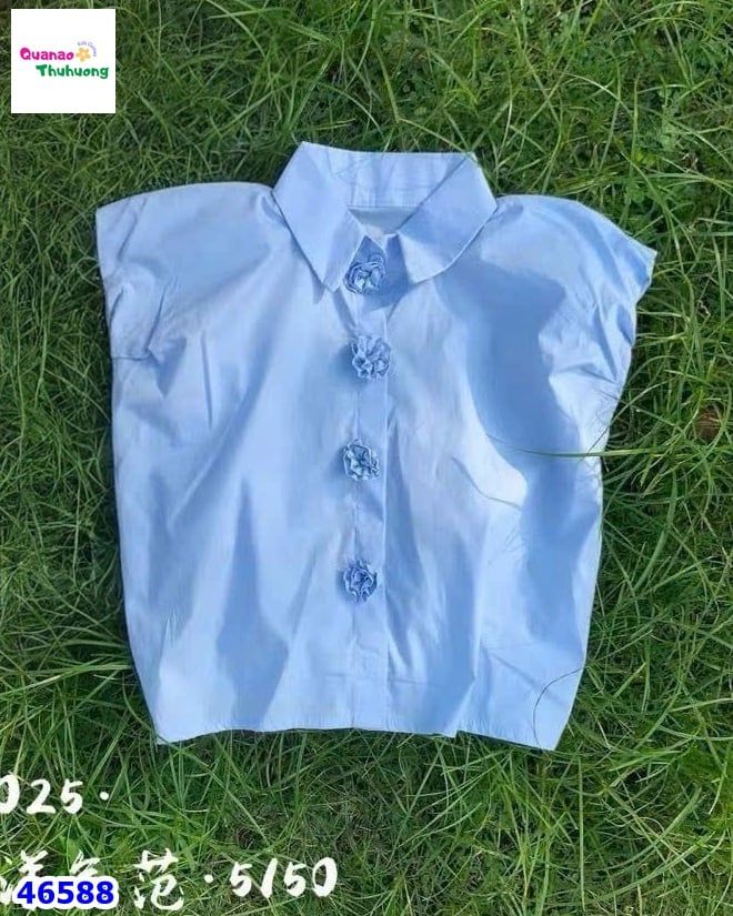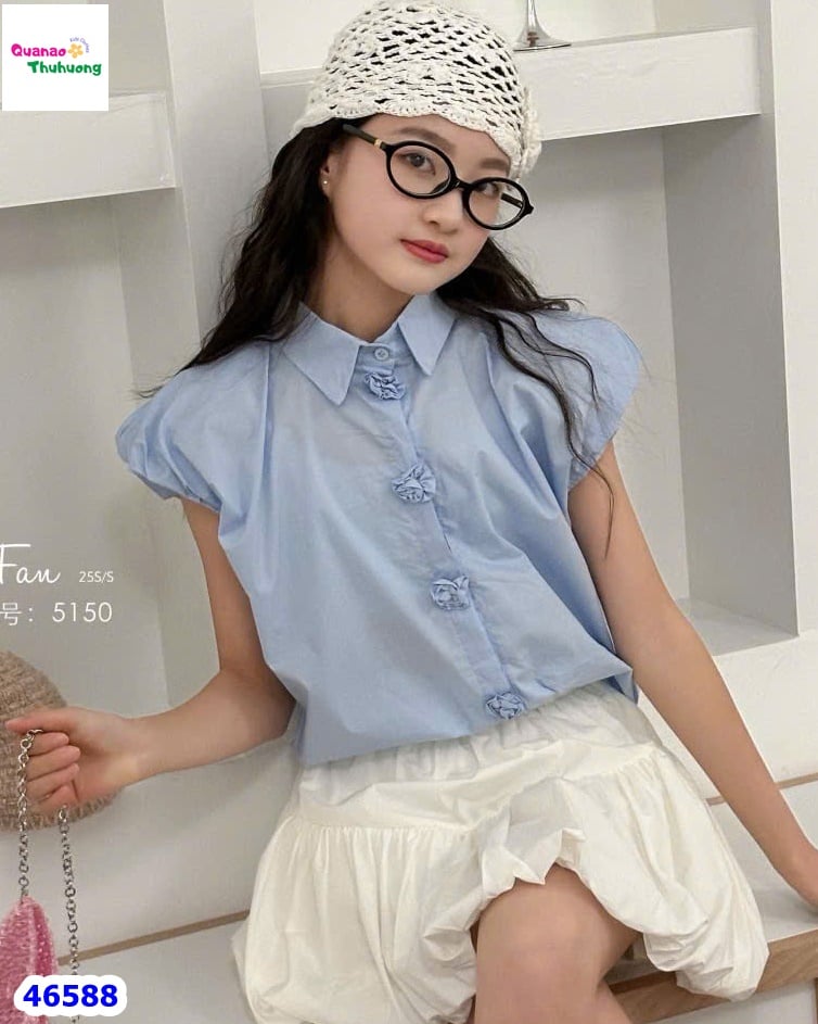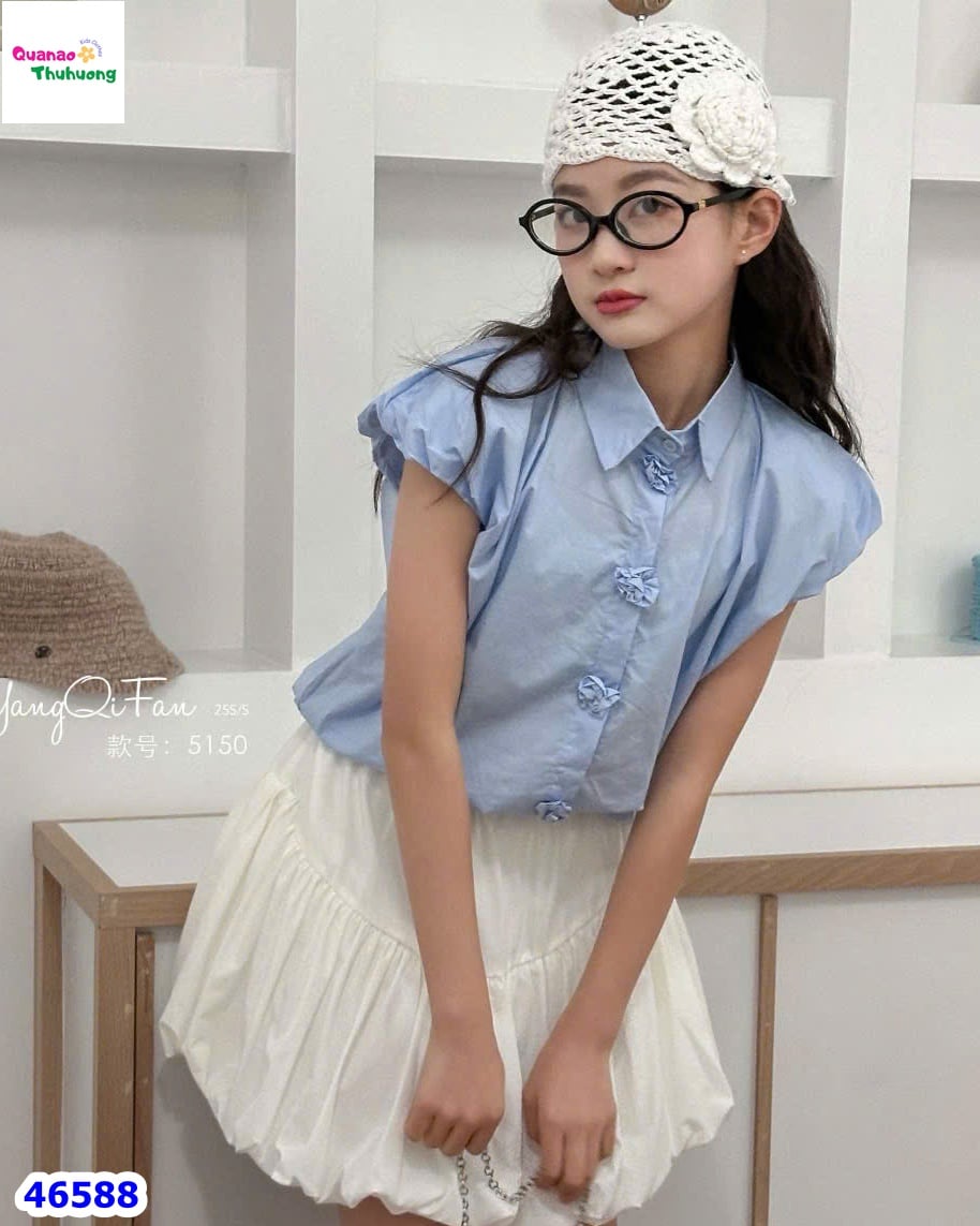 - Áo sơ mi xanh pastel nhẹ nhàng, điểm nhấn hàng nút hoa xinh yêu, mang đến vẻ dịu dàng và tươi tắn cho bé