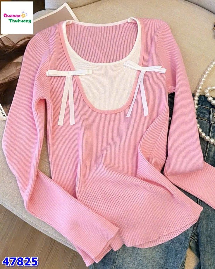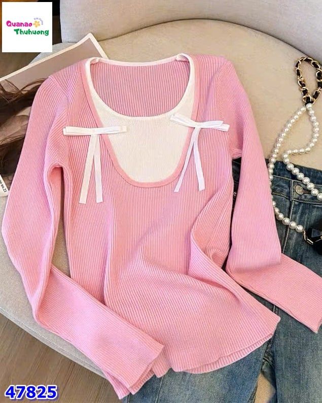 Áo tay dài hồng kem nơ