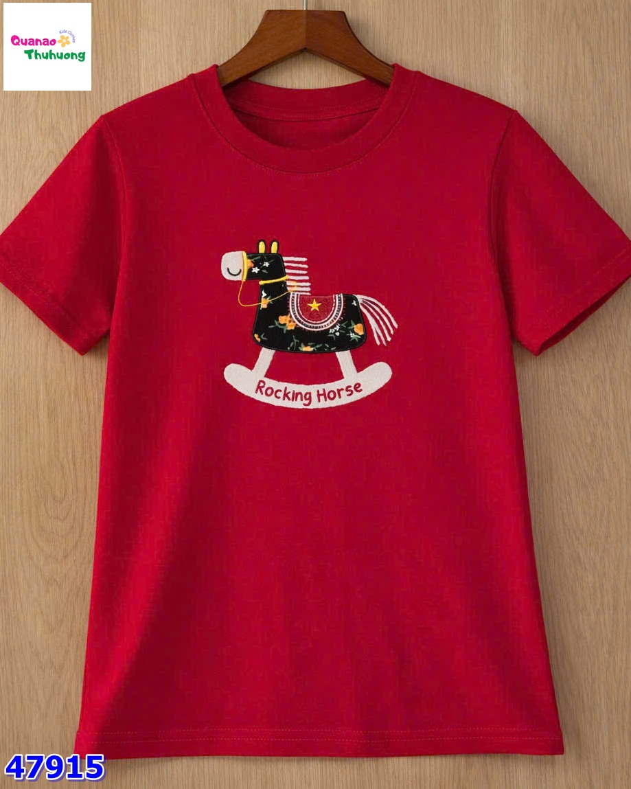 Áo thun đỏ thêu hình ngựa nổi bật, màu sắc tươi tắn tạo điểm nhấn năng động cho bé.