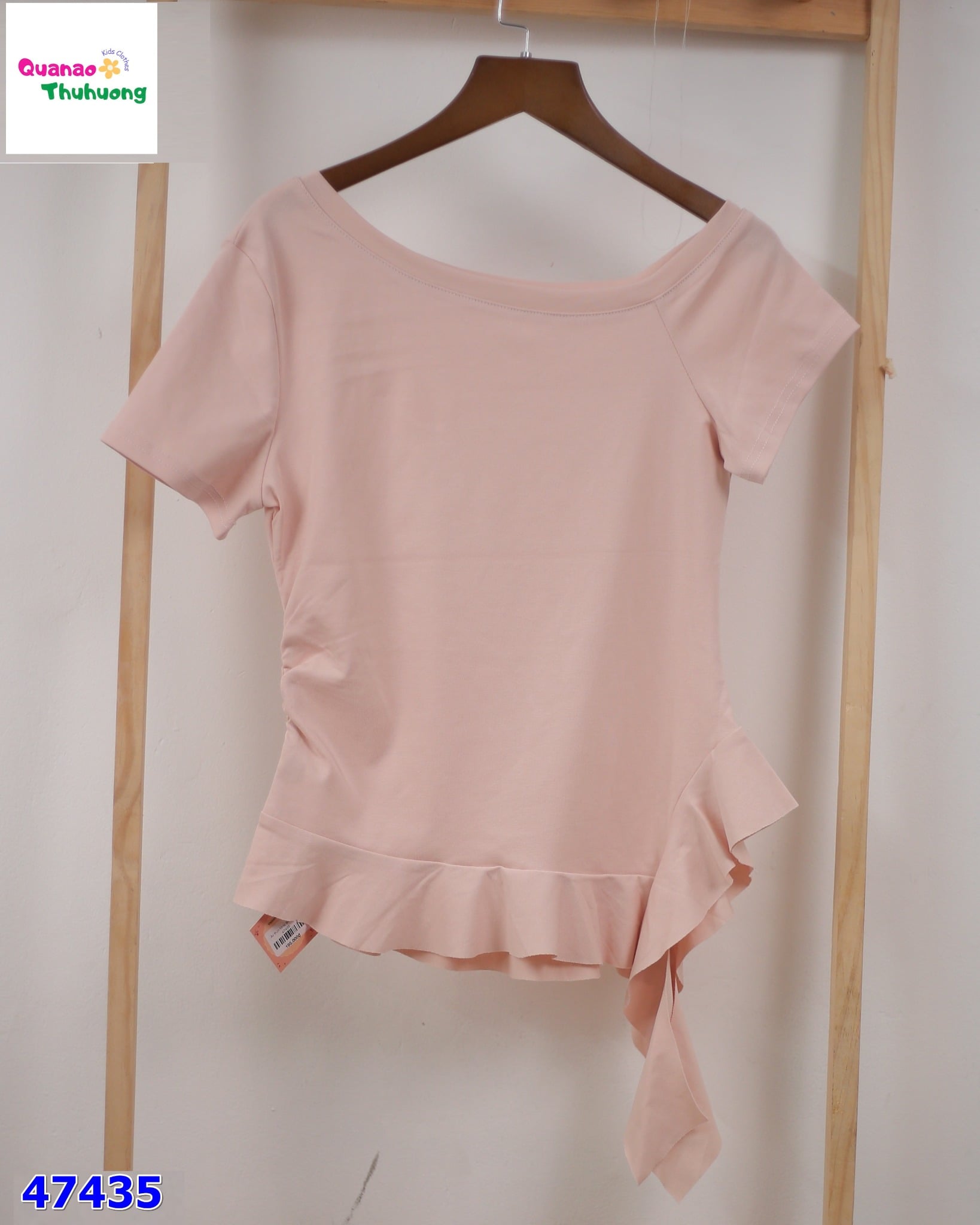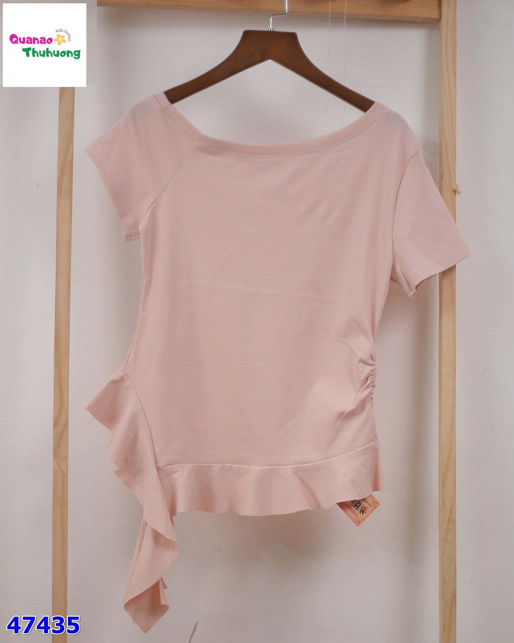 - Áo thun hồng kiểu lệch vai nhẹ, tạo điểm nhấn hiện đại và nữ tính cho bé