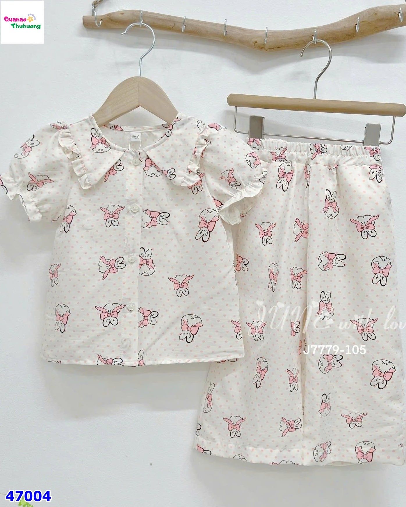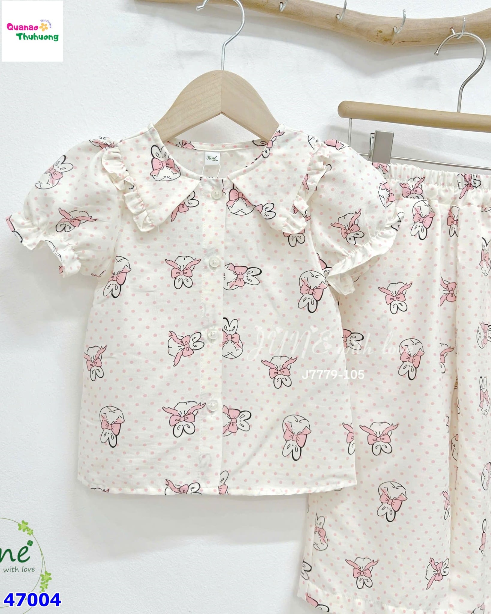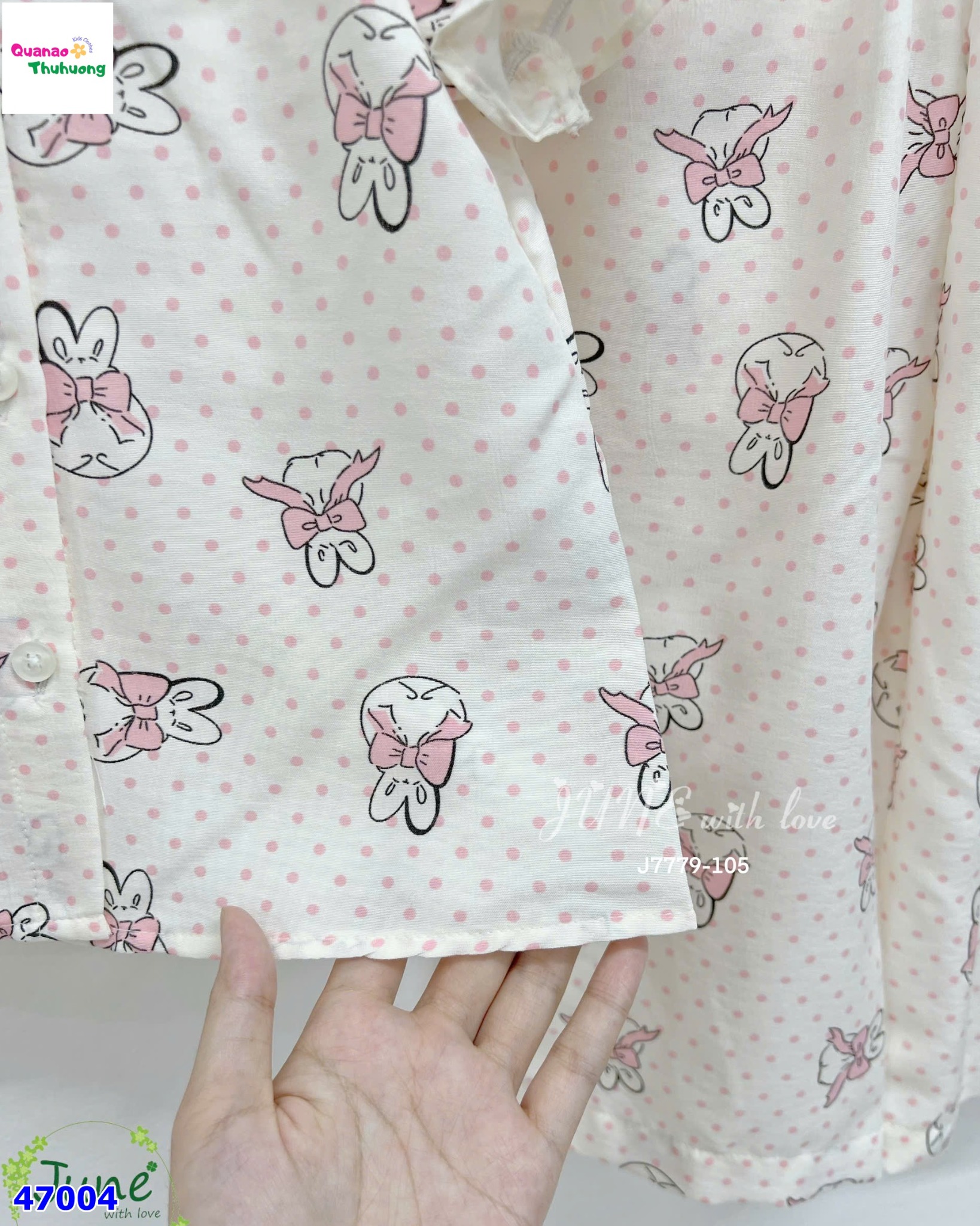 - Thiết kế đáng yêu: Tông màu hồng pastel nhẹ nhàng, phối họa tiết chấm bi xinh xắn, điểm nhấn là hình thỏ cực kỳ dễ thương – bé nào mặc cũng nổi bần bật!