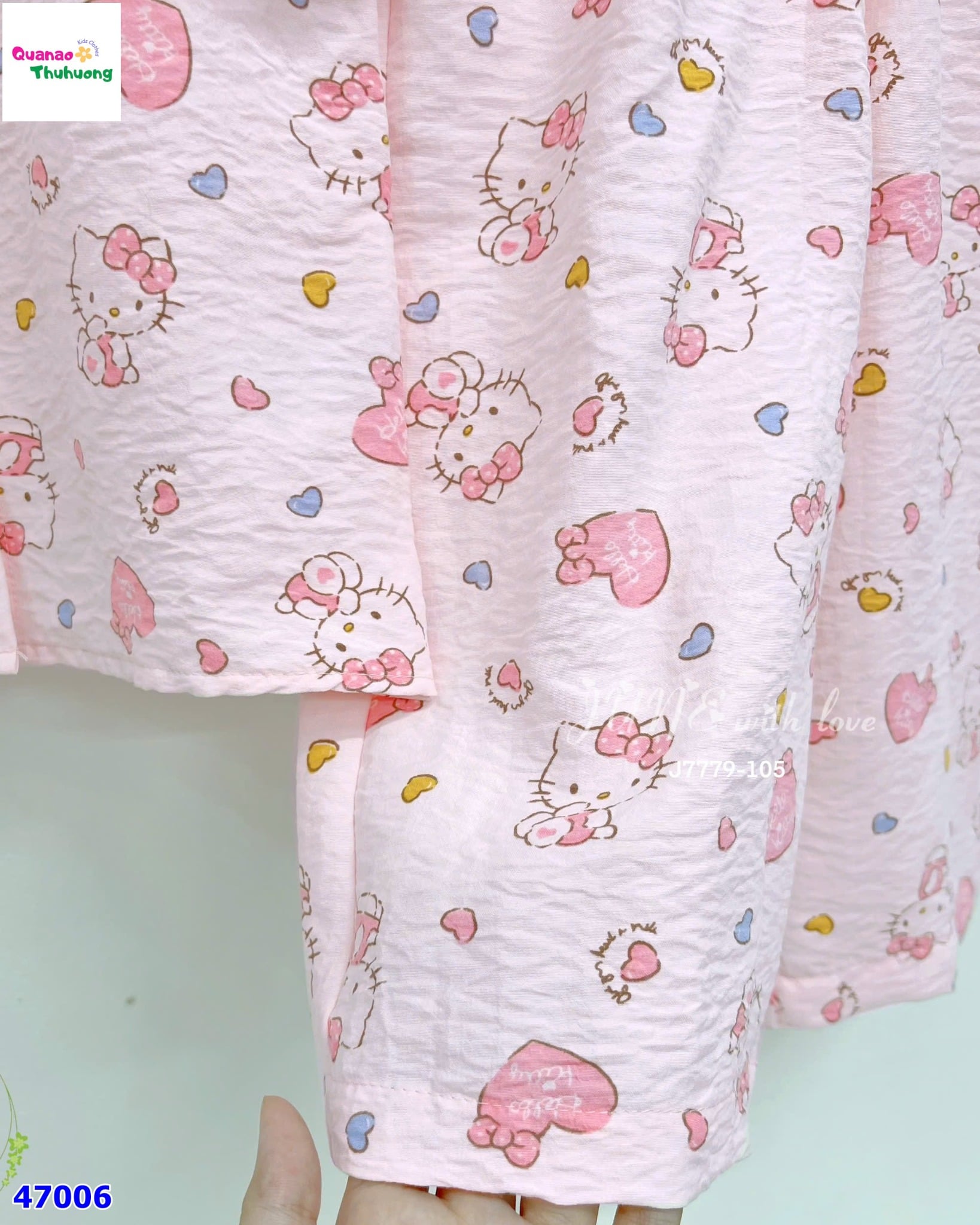 - Thiết kế đáng yêu: Tông màu hồng pastel nhẹ nhàng, phối họa tiết tim xinh xắn, điểm nhấn là hình mèo Kitty cực kỳ dễ thương – bé nào mặc cũng nổi bần bật!