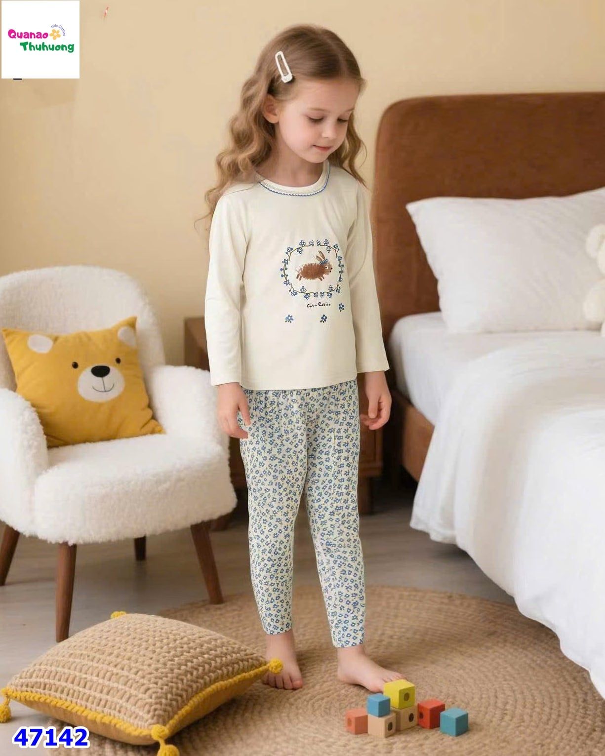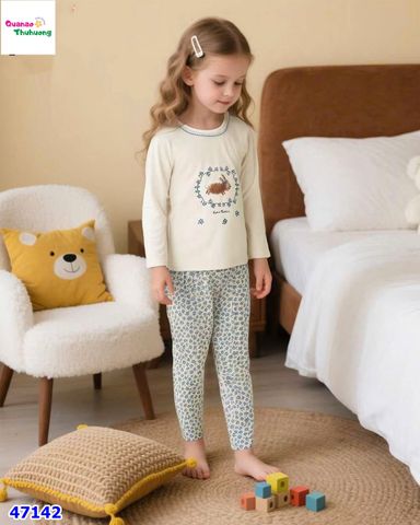- Áo tay dài màu kem in hình chú thỏ nhỏ xinh giữa vòng hoa, chất cotton mềm mại, thấm hút tốt cho bé luôn thoải mái.