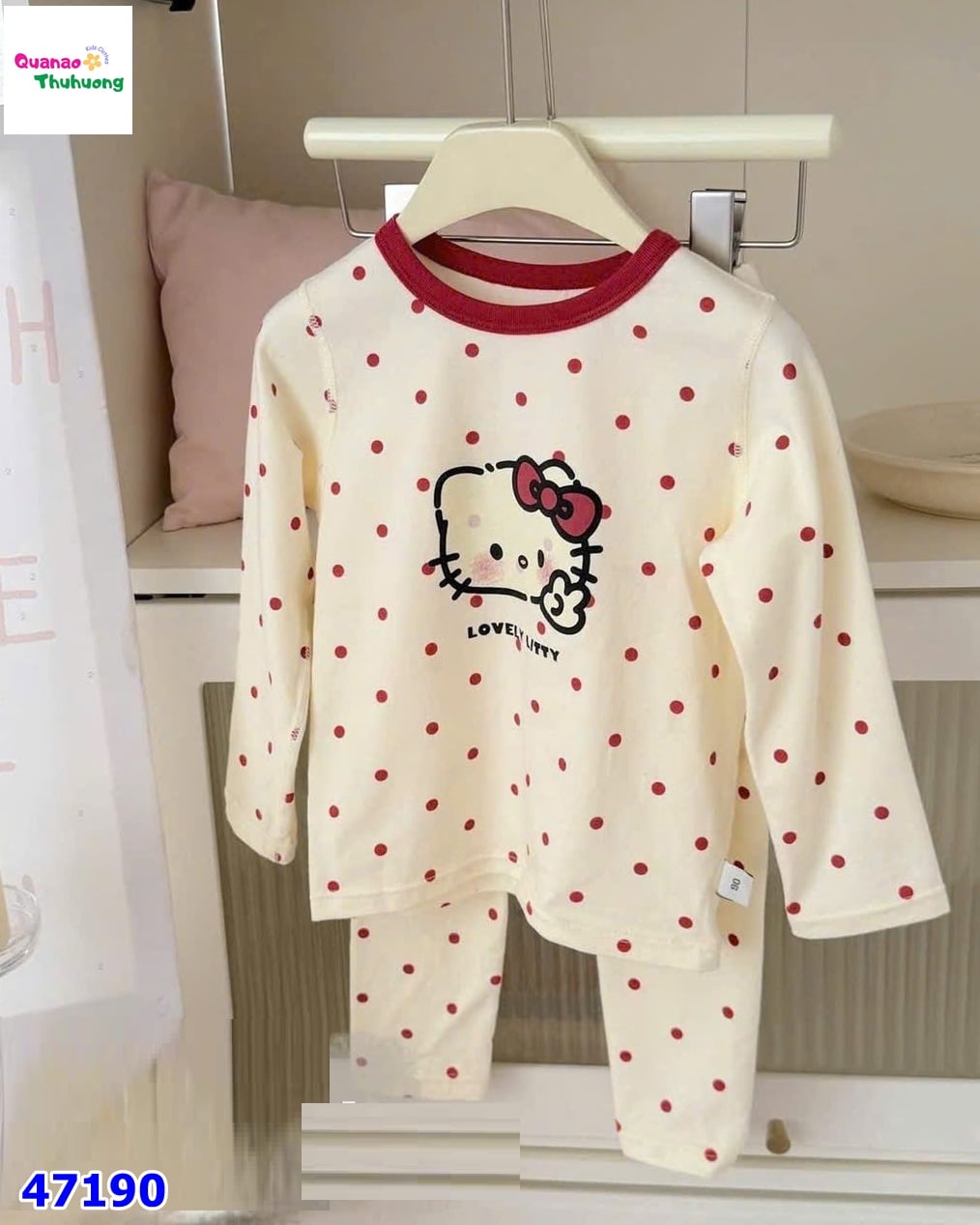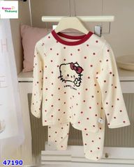 Set đồ tông kem phối hoạ tiết Kitty chấm bi đỏ nổi bật, mang đến vẻ đáng yêu và tươi tắn cho bé yêu.