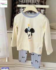 Nền kem viền cổ xanh nhạt in hình Mickey đội mũ sinh nhật cực dễ thương cho bé , quần xanh đồng bộ sọc họa tiết Mickey