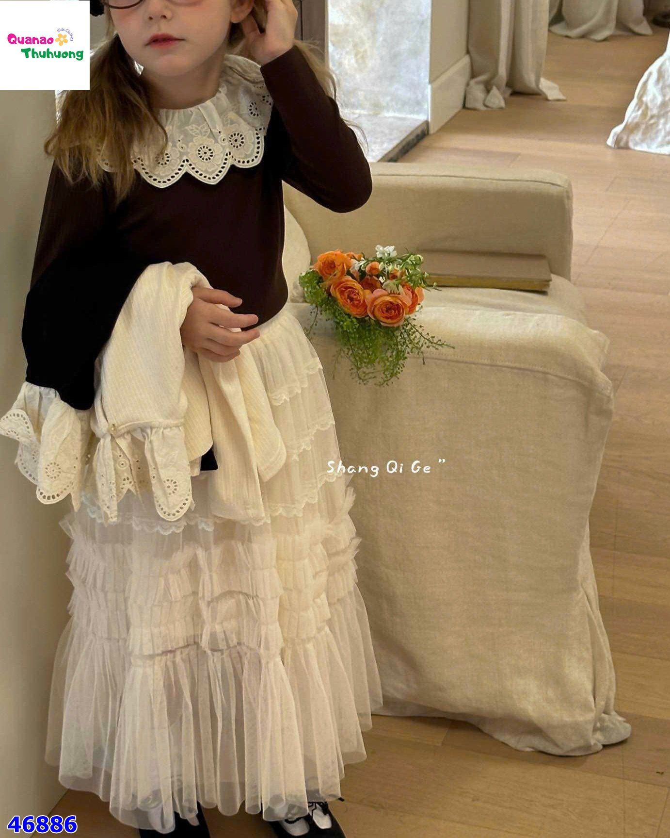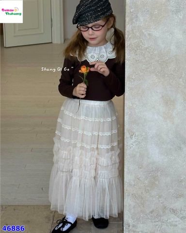 chân váy dài, xòe nhẹ, có nhiều lớp ren được viền bằng ren nhỏ cực xinh xắn