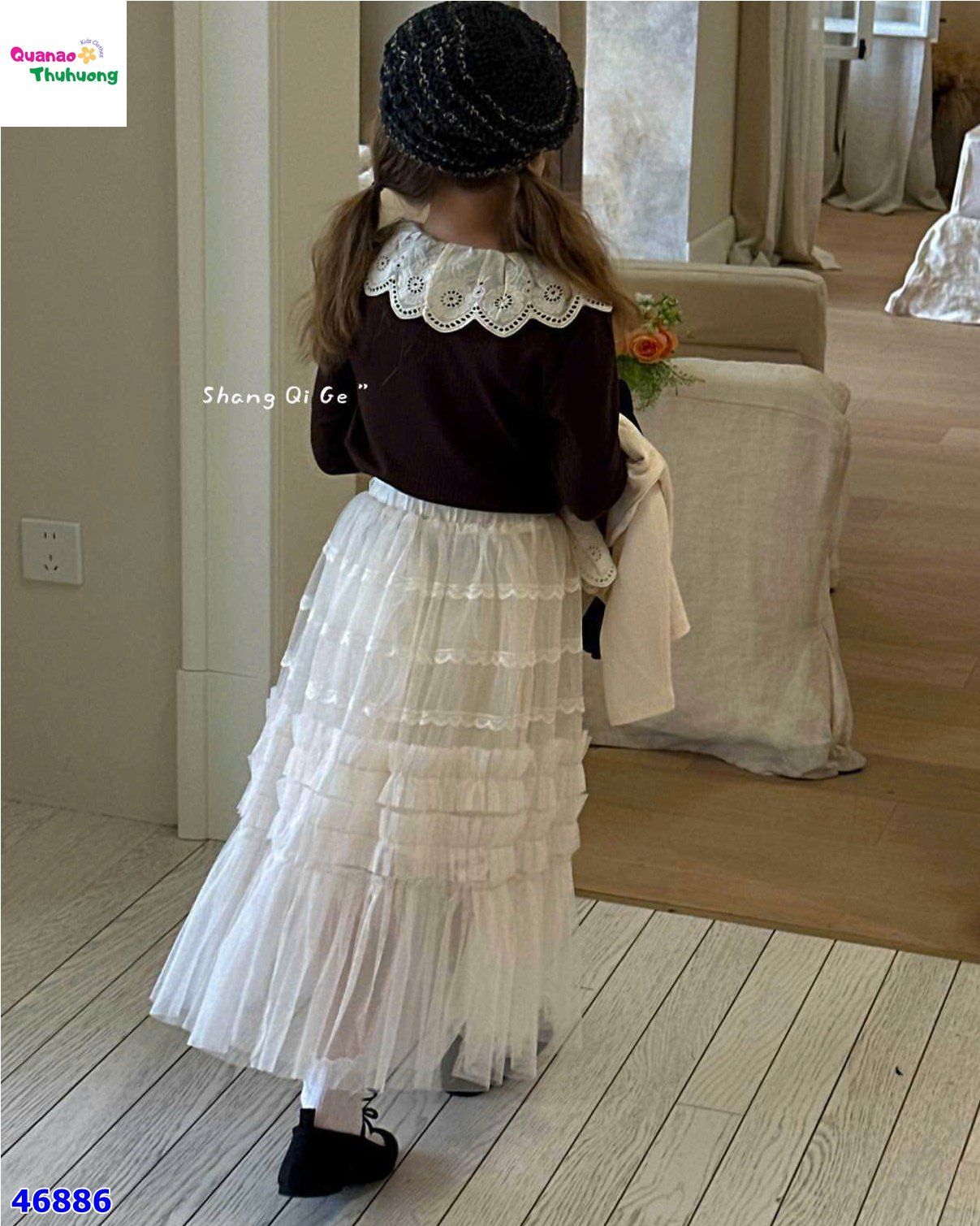 Chân váy viền tạo độ bồng bềnh và mềm mại.