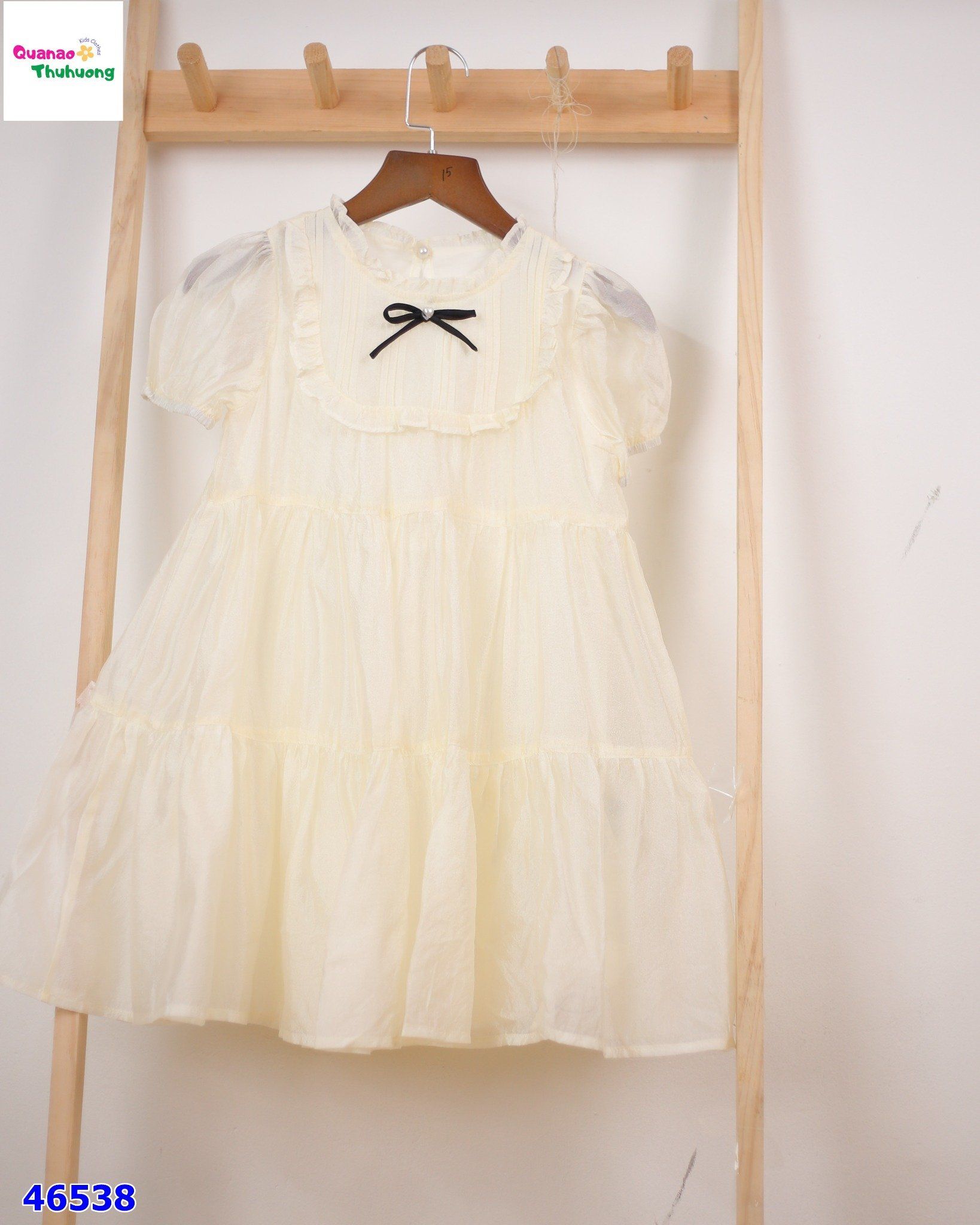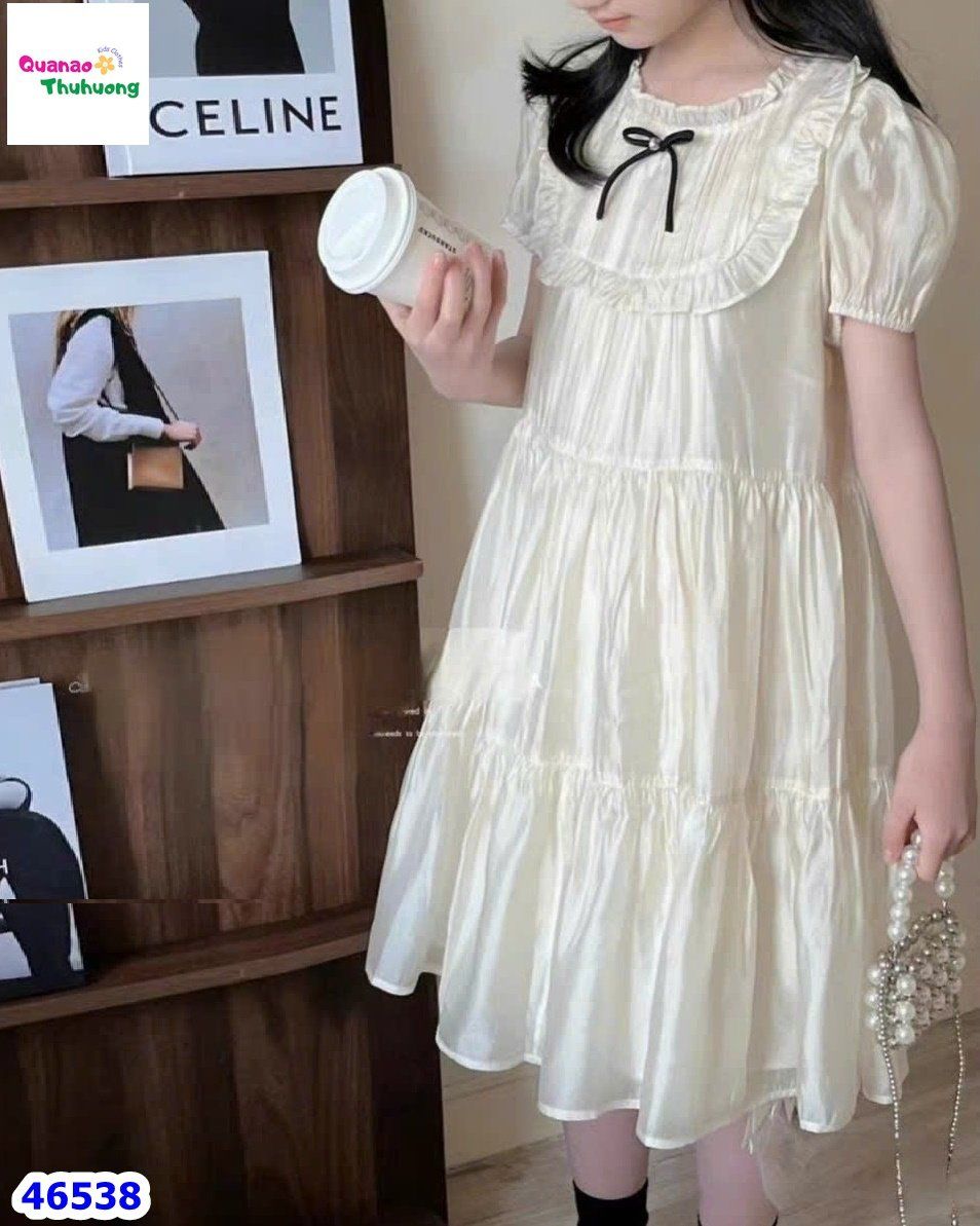 - Màu kem nhẹ nhàng kết hợp với nơ đen nổi bật, tạo nên chiếc đầm siêu “chanh sả” cho bé yêu!