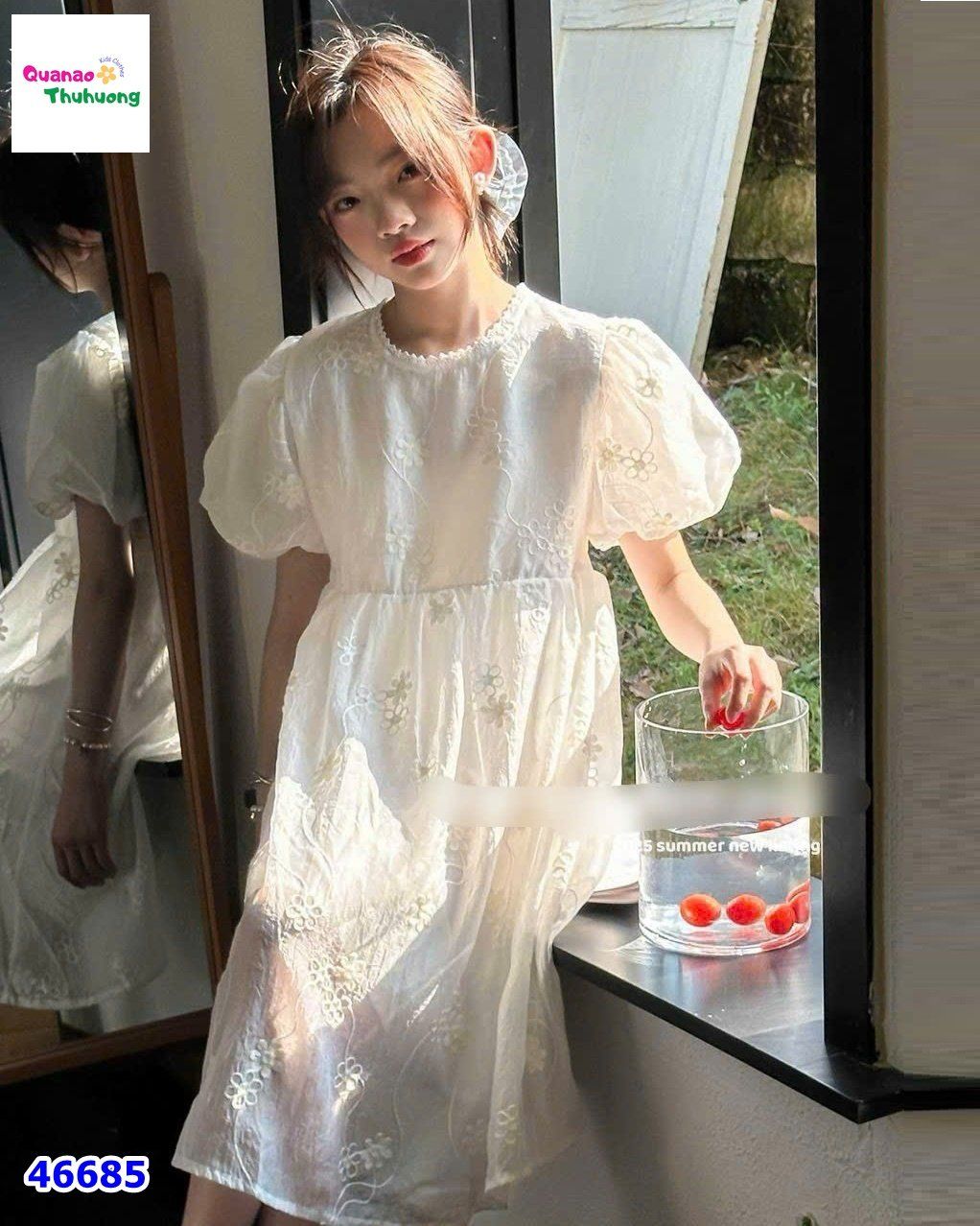 - Màu kem nhẹ nhàng kết hợp với nơ thêu nổi bật, tạo nên chiếc đầm siêu “chanh sả” cho bé yêu!