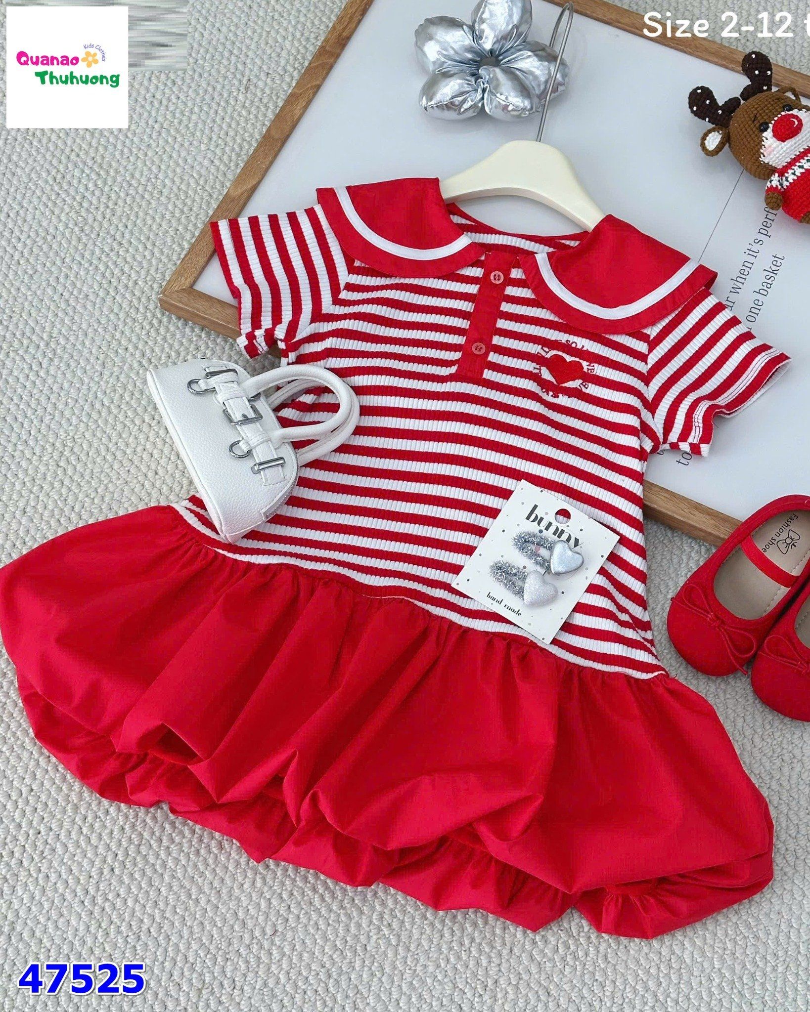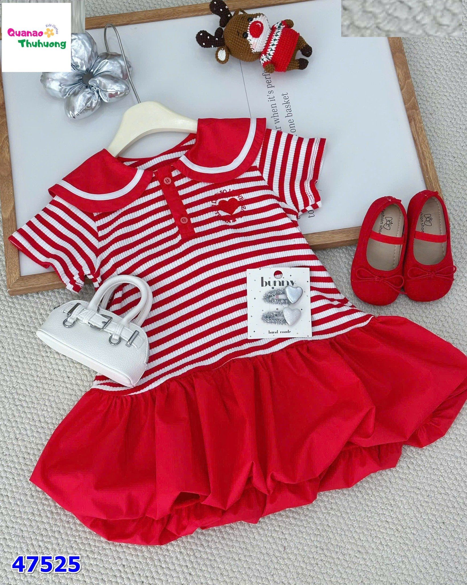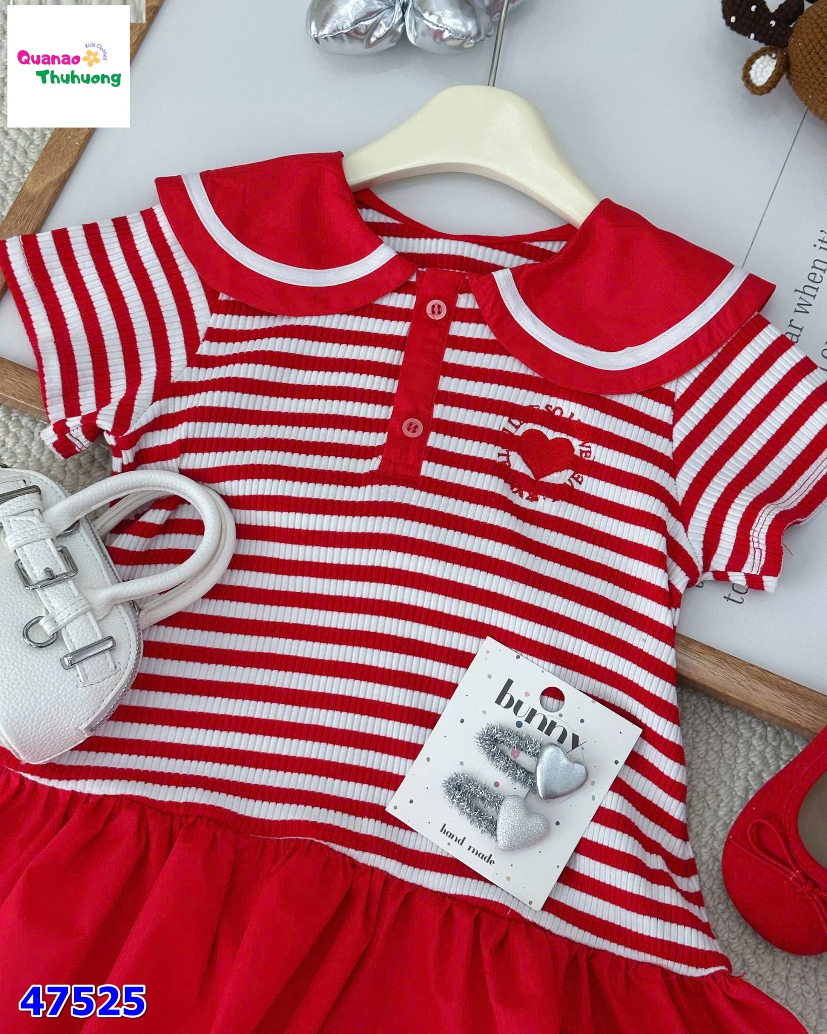 Họa tiết sọc đỏ – trắng nổi bật, phối dáng xòe nhẹ giúp bé mặc vào là xinh tươi rạng rỡ