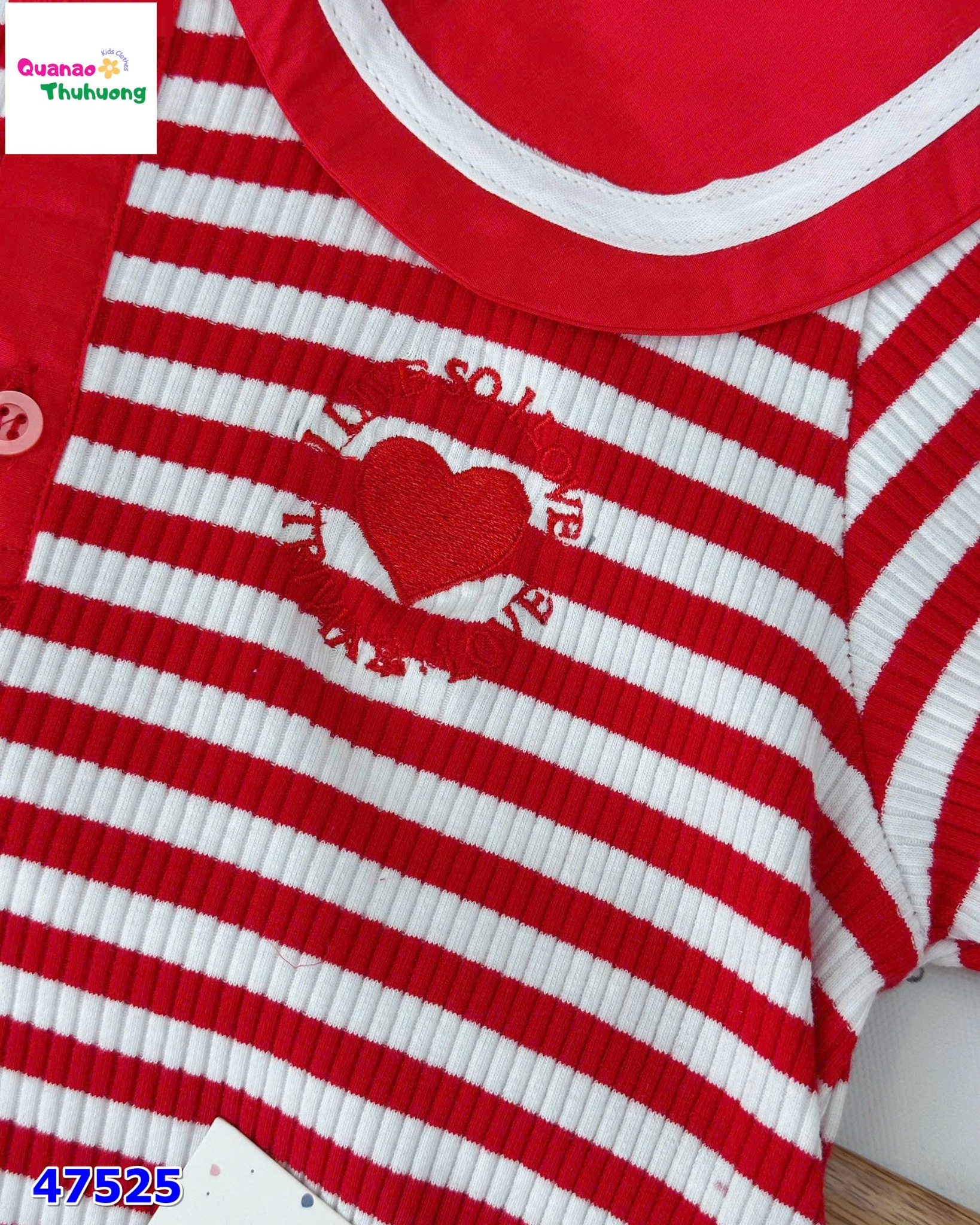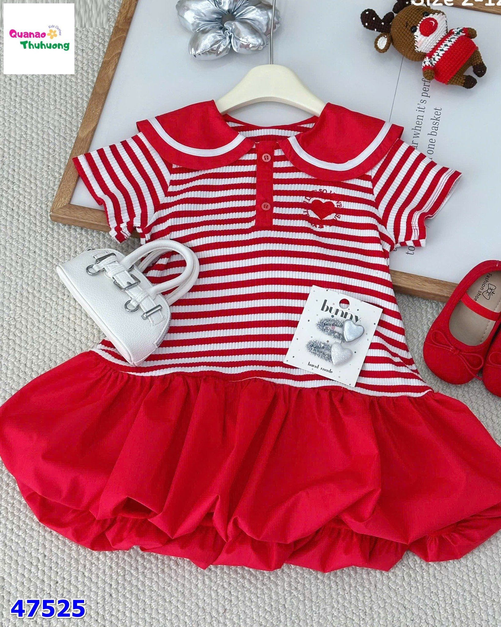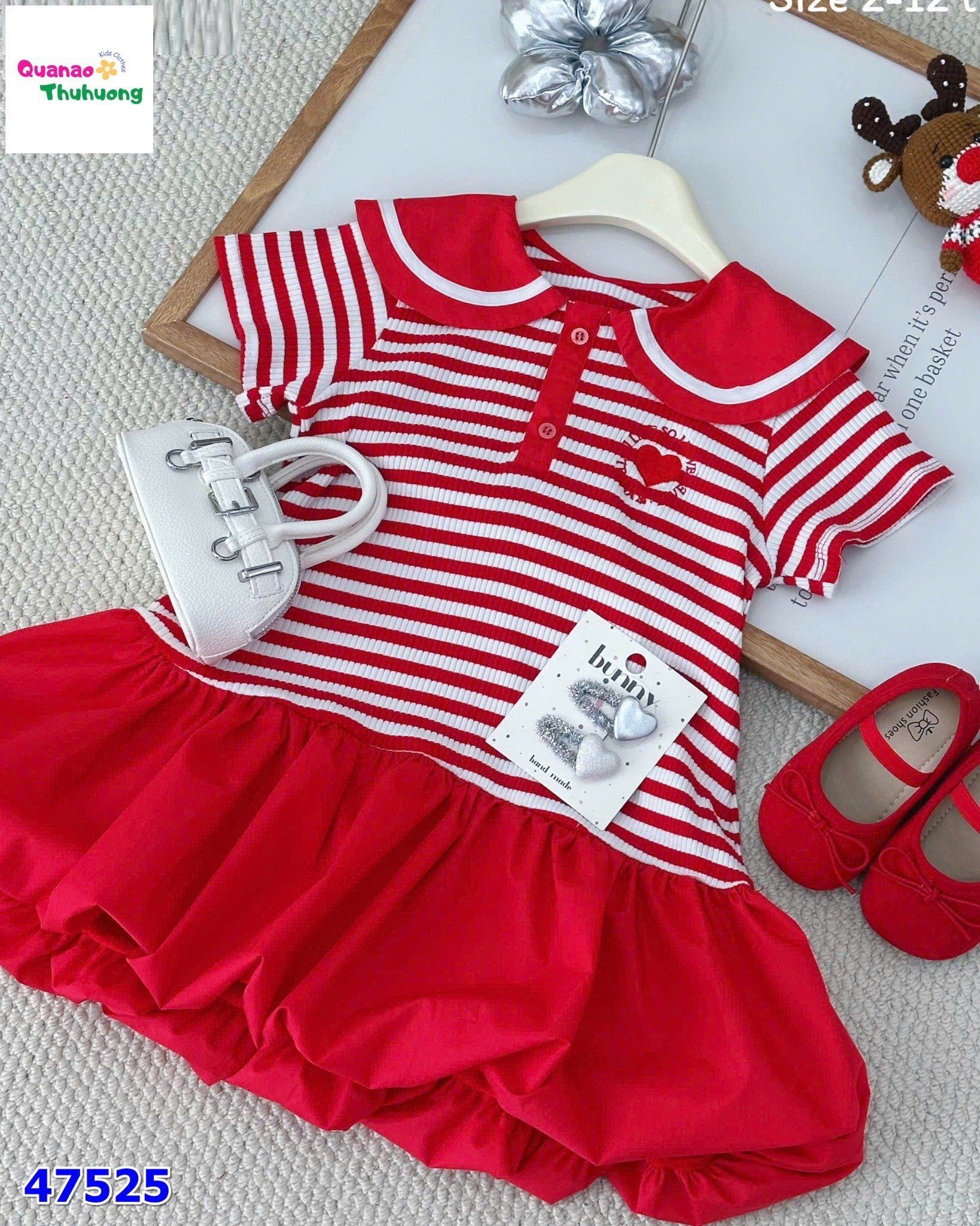 Họa tiết sọc đỏ – trắng nổi bật, phối dáng xòe nhẹ giúp bé mặc vào là xinh tươi rạng rỡ