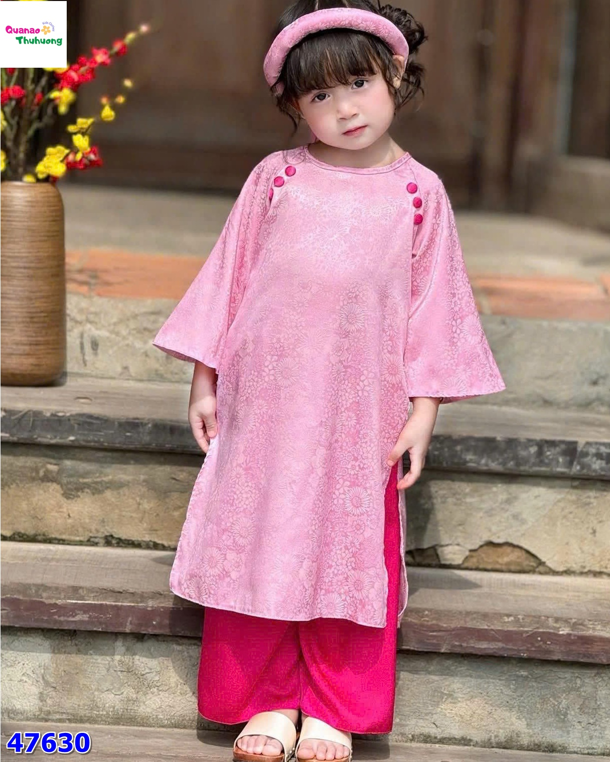 Áo dài Babies Mo chất lụa hồng mềm mịn, nhẹ nhàng và thoáng mát cho bé diện cả ngày