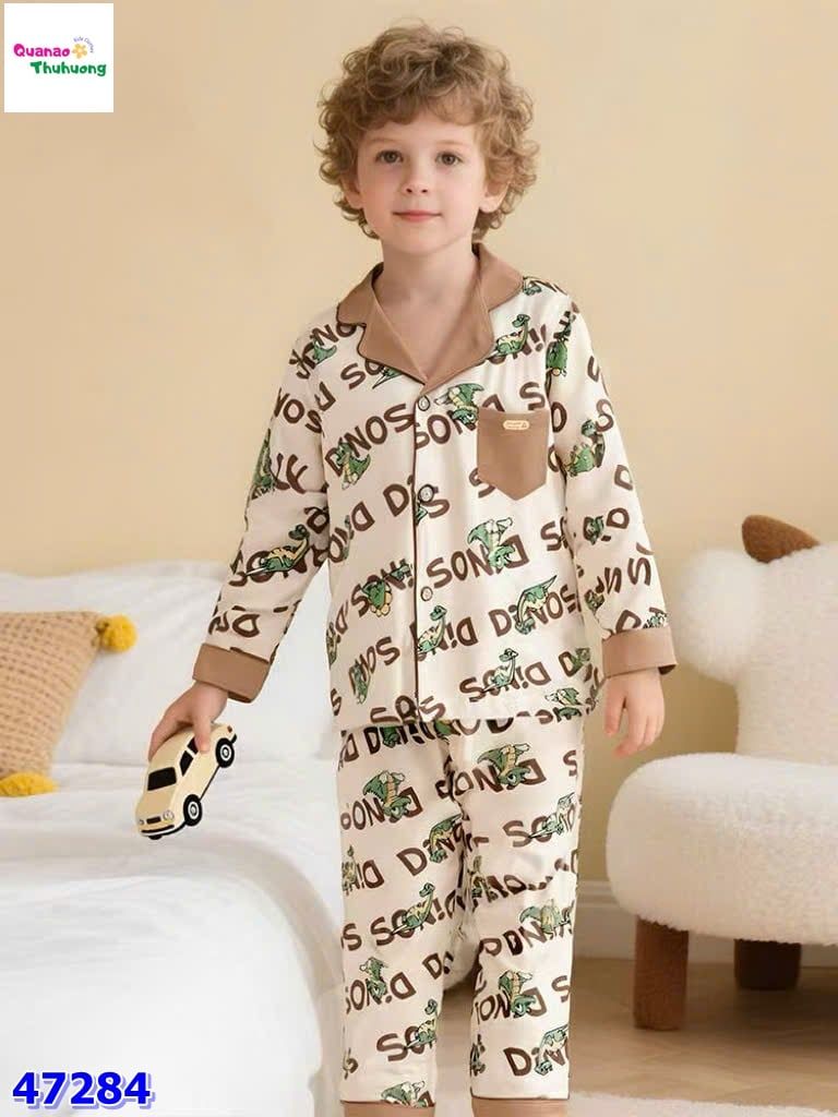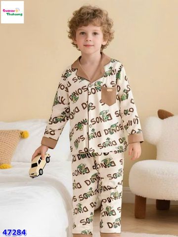 - Tông be nhã nhặn in chữ và hình khủng long đáng yêu, cổ và tay viền nâu nổi bật, giúp bé trai thêm năng động, dễ thương.