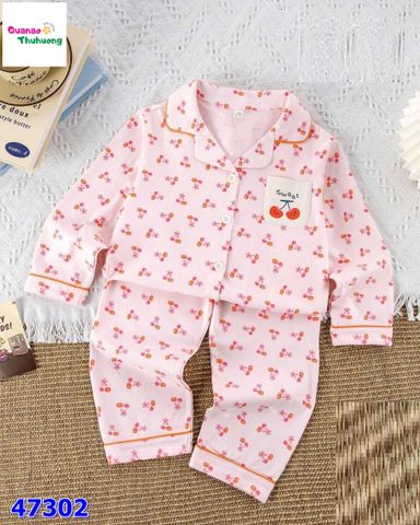- Bộ pyjama hồng baby ngọt ngào, hoạ tiết cherry đáng yêu cùng đường viền cam nổi bật.