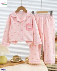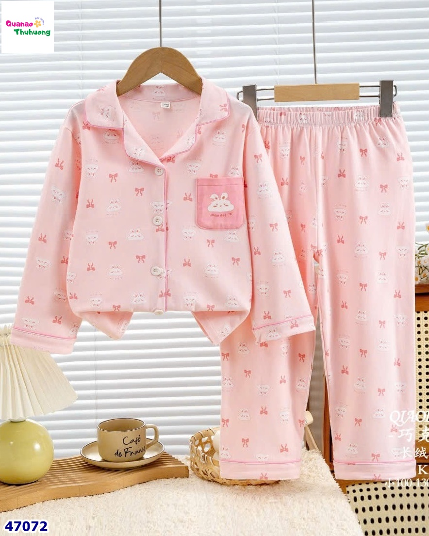 -Set đồ ngủ dễ thương với tông hồng ngọt ngào, họa tiết thỏ nơ xinh xắn.