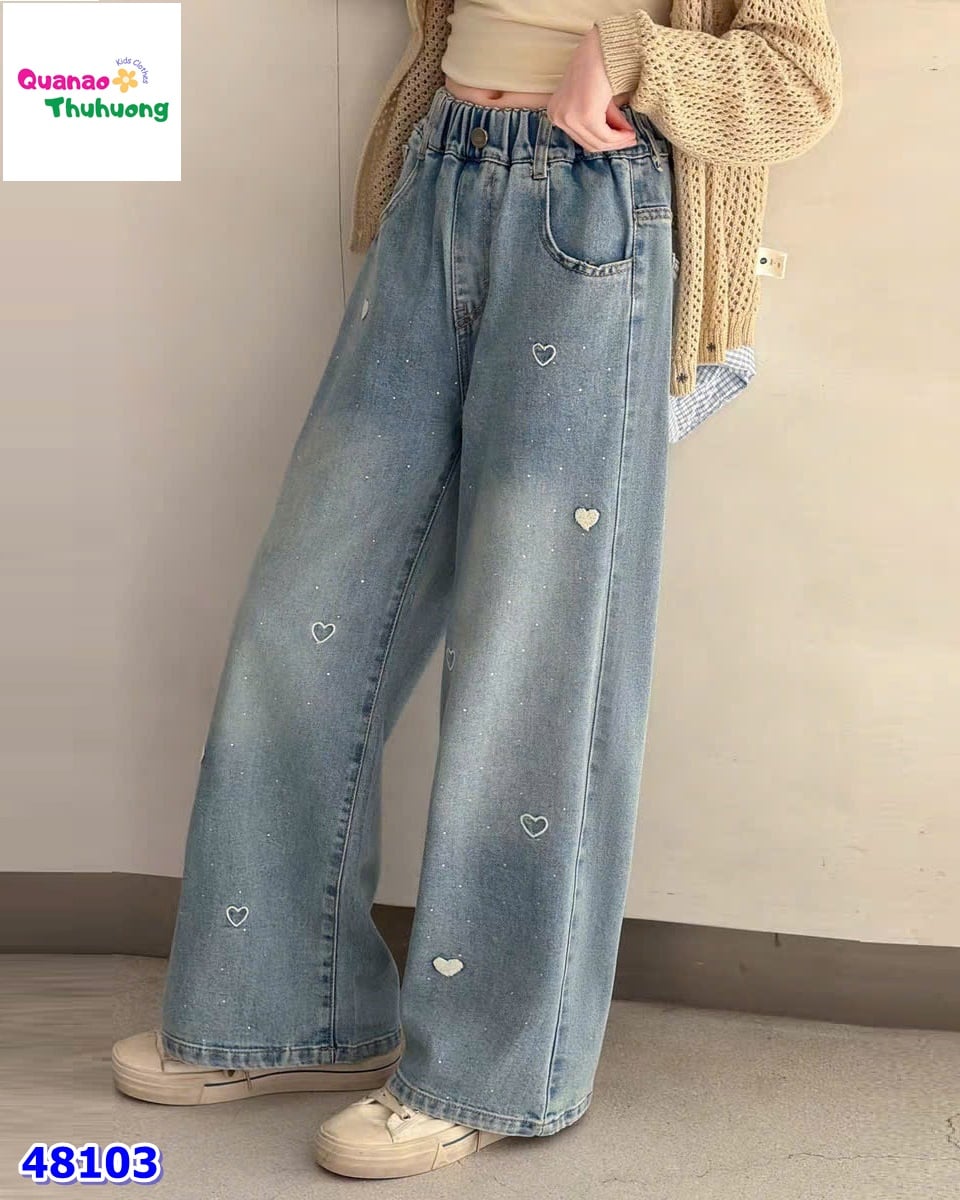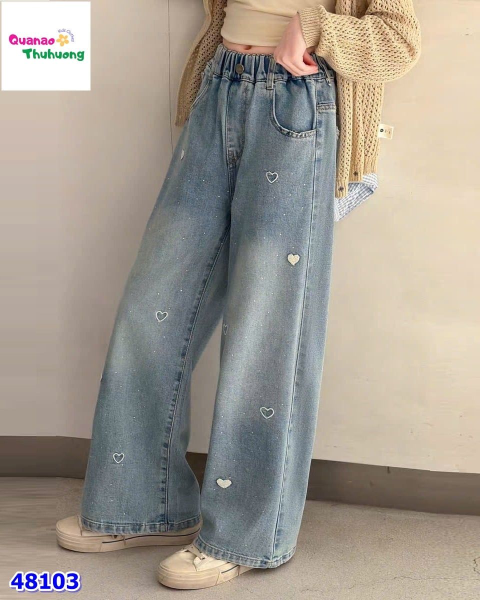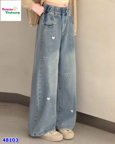 Quần jean dài xanh điểm họa tiết trái tim xinh xắn, form gọn gàng dễ mặc.