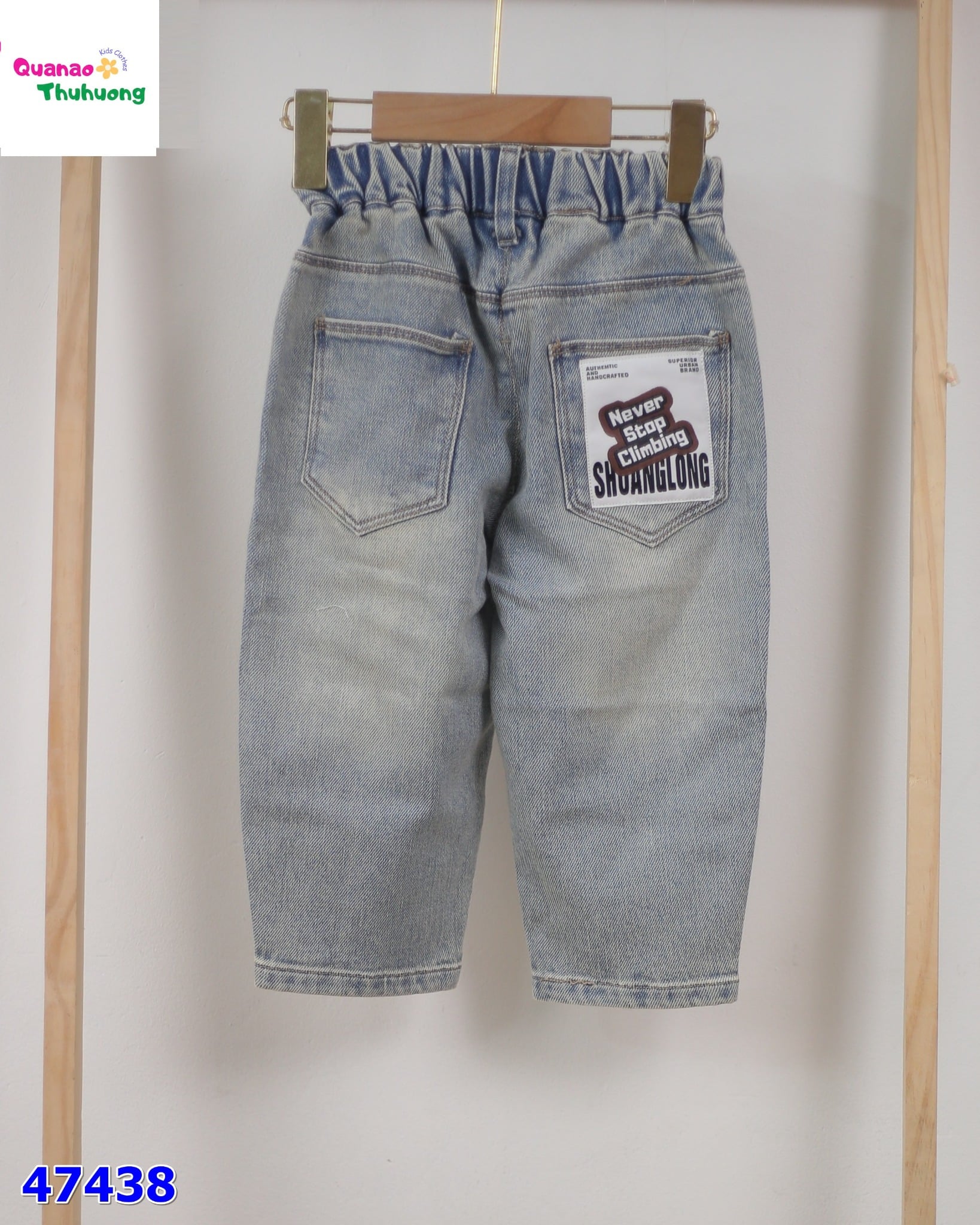 - Quần jean xanh cho bé với form suông năng động, chất jean mềm dễ vận động