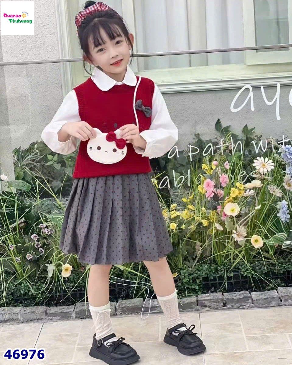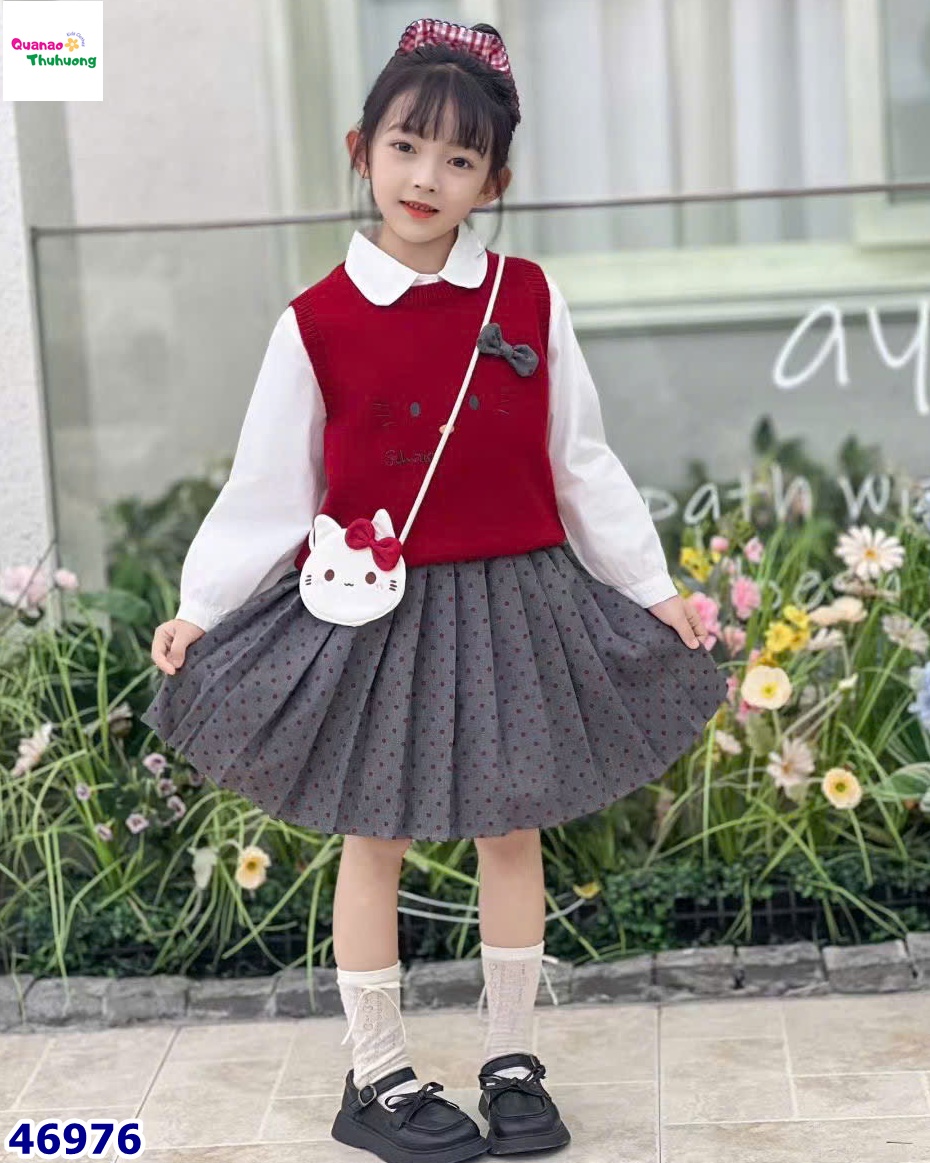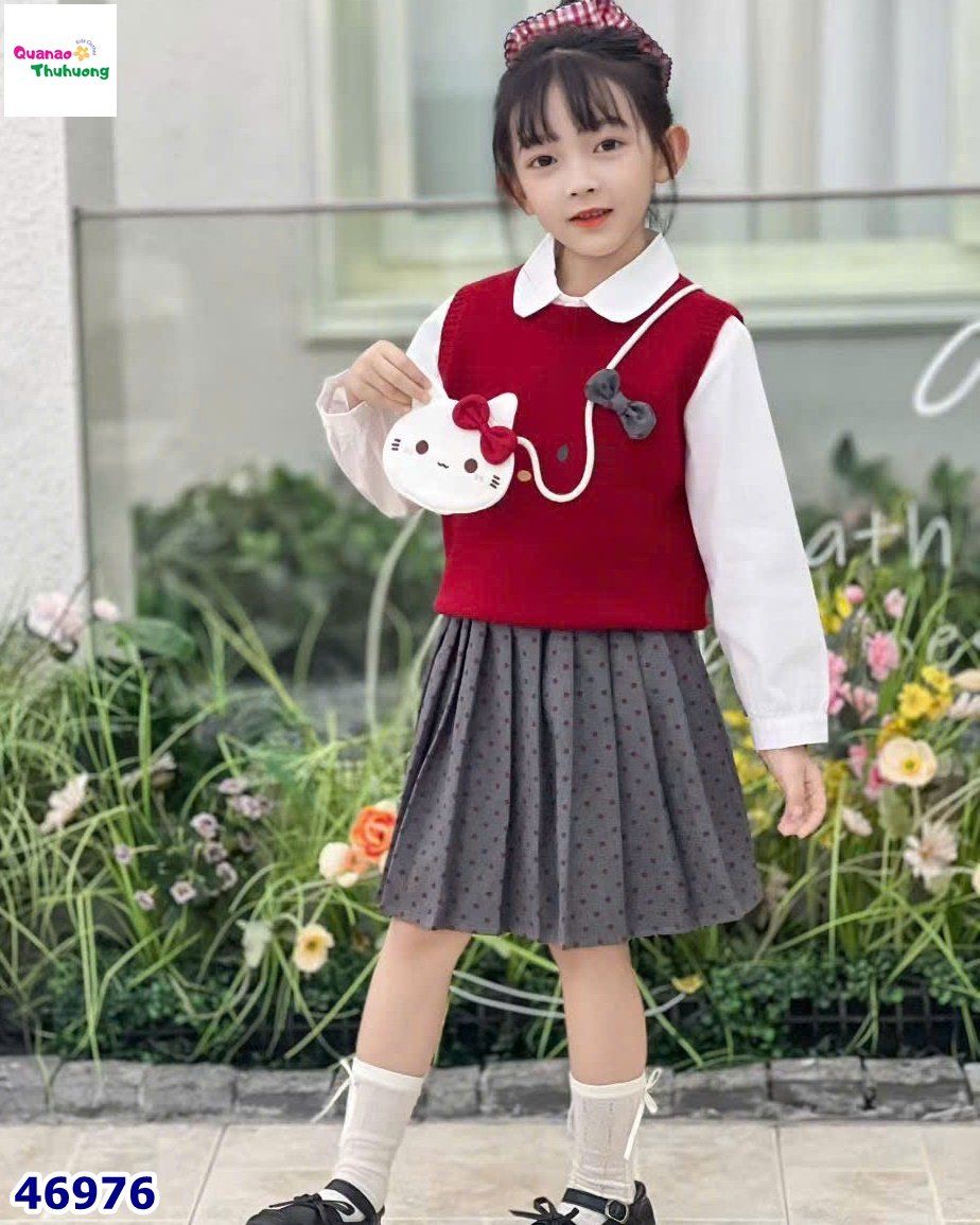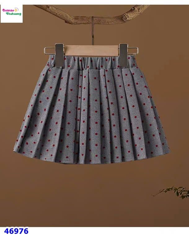 👗 Chân váy xếp ly màu xám chấm bi đỏ, mềm nhẹ, giữ form tốt.
