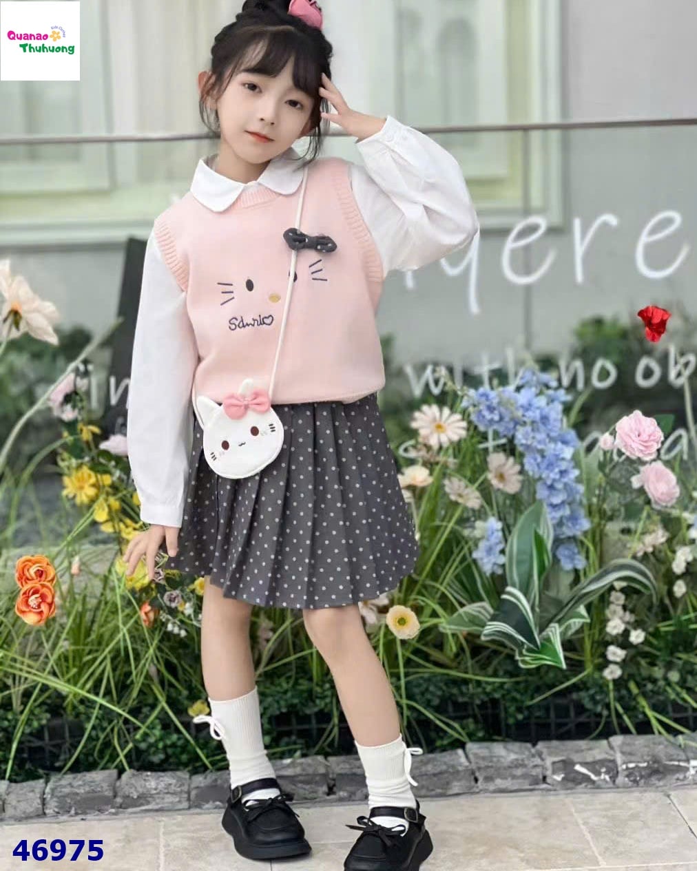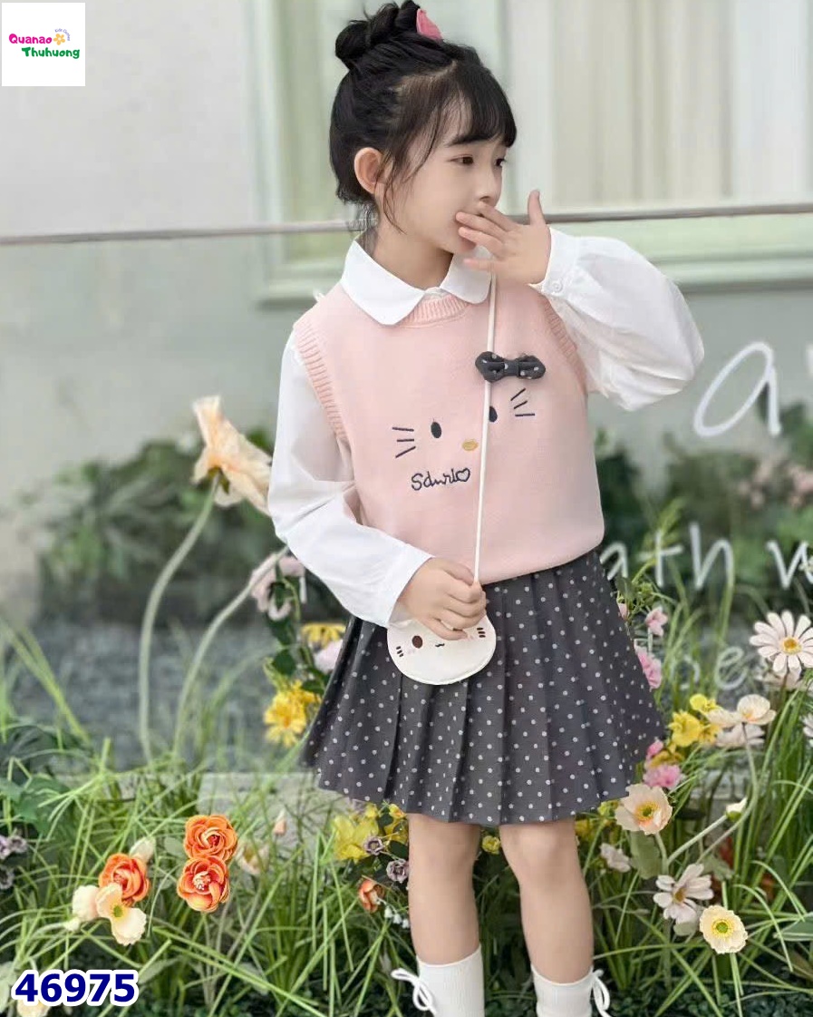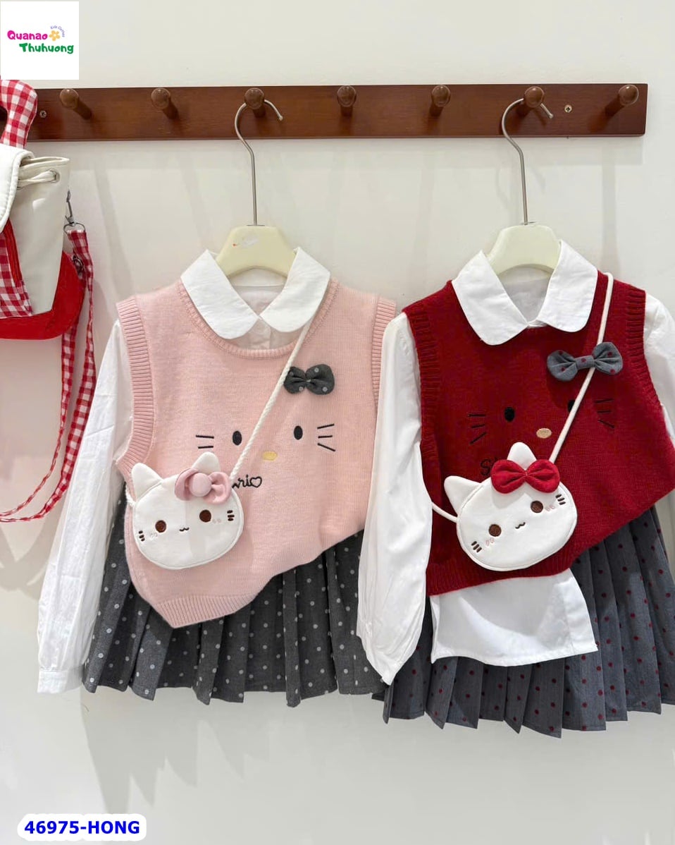 💗 Set 3: sơ mi, chân váy xám, gile hồng Kitty (tặng túi đeo) 💗