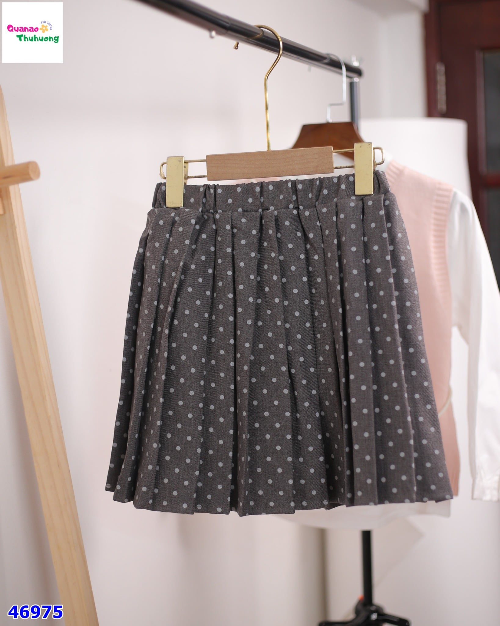 👗 Chân váy xếp ly màu xám chấm bi trắng, form xòe vừa phải – mềm mại – thoáng mát.