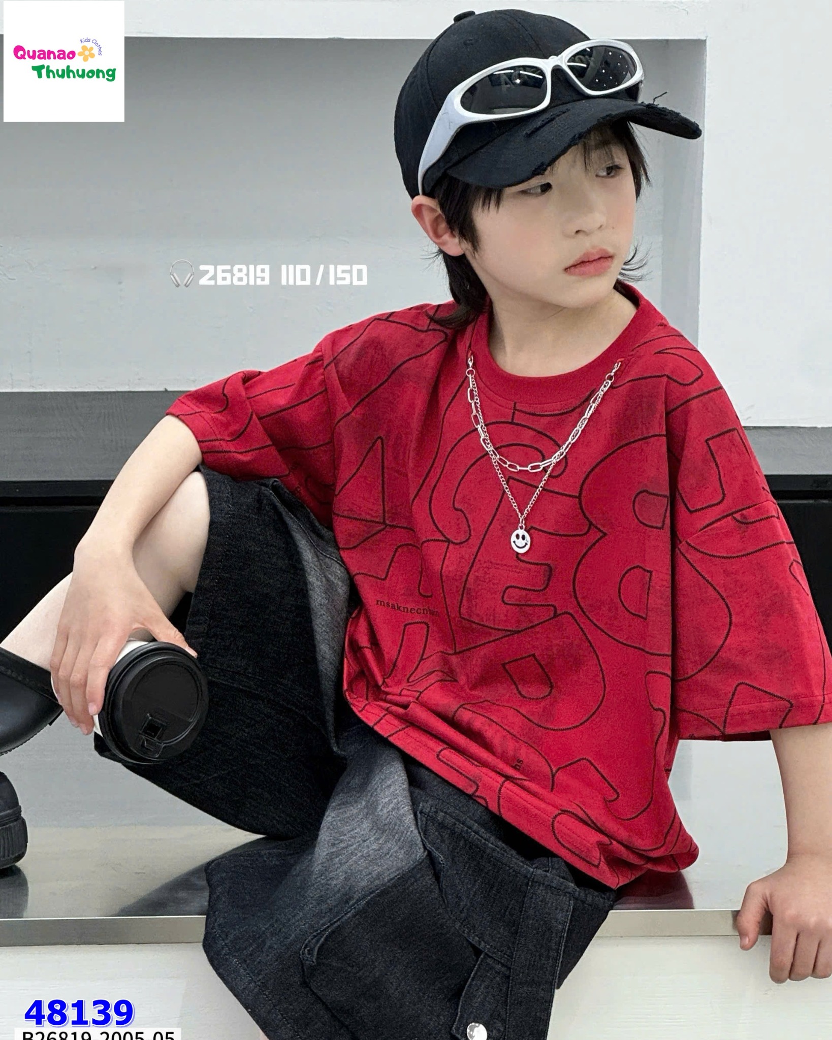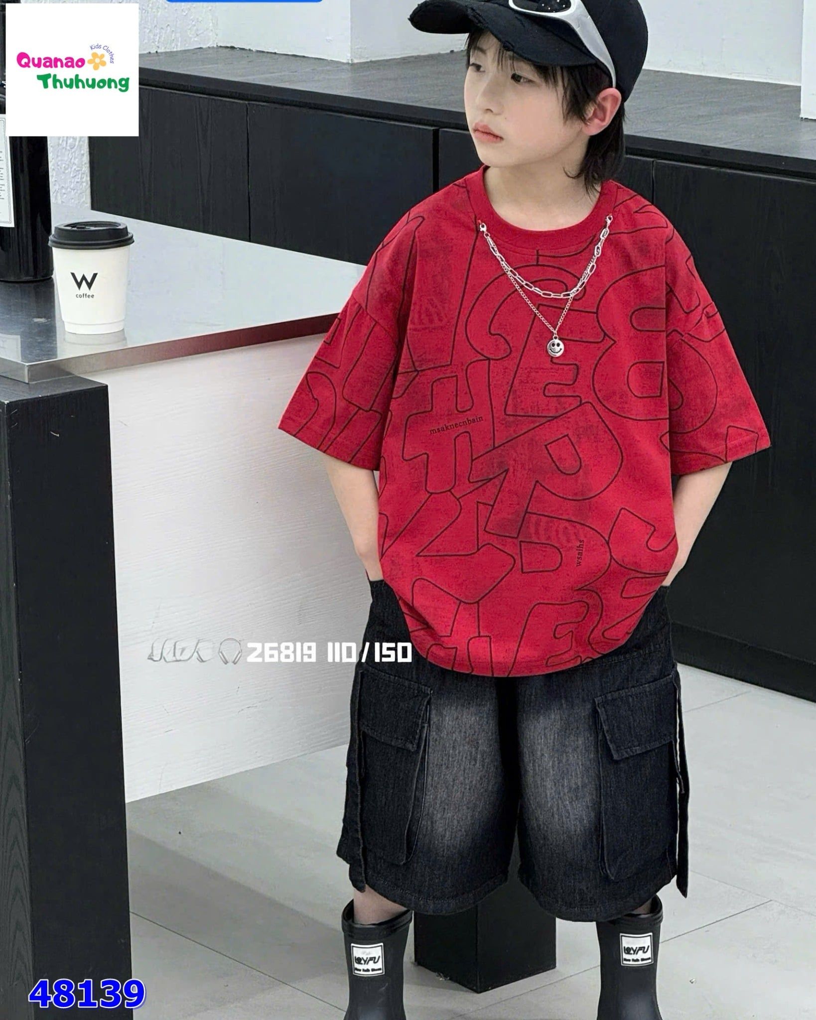 Set áo đỏ chữ cái, quần jean đen