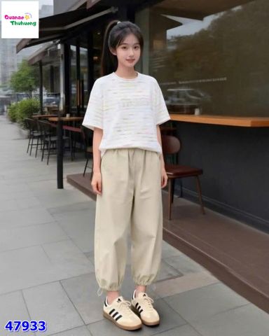 Quần kem form thoải mái, chất vải mềm mịn, bé vận động cả ngày vẫn dễ chịu.