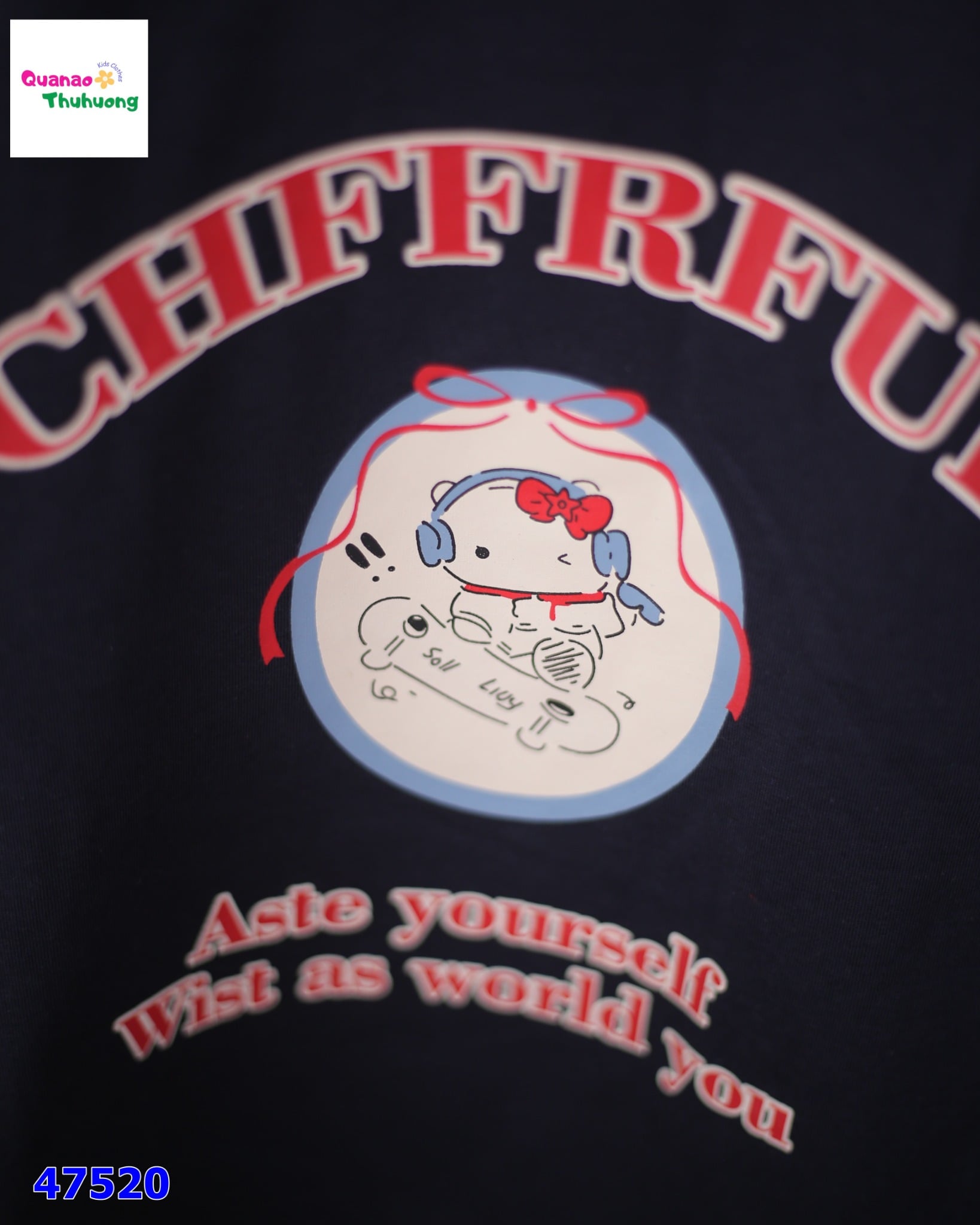 🐱 Hình Hello Kitty dễ thương in nổi bật trên nền áo xanh.