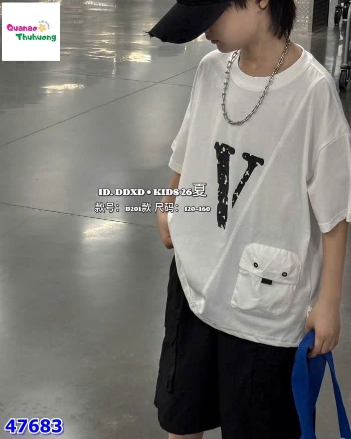 Set thun basic nhưng cực xinh: áo trắng in chữ V nổi bật, chất thun mềm mát cho bé mặc thoải mái cả ngày