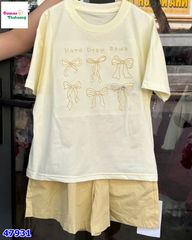 áo vàng tươi nổi bật, điểm nhấn nơ nhẹ nhàng tạo cảm giác ngọt ngào, dễ thương.