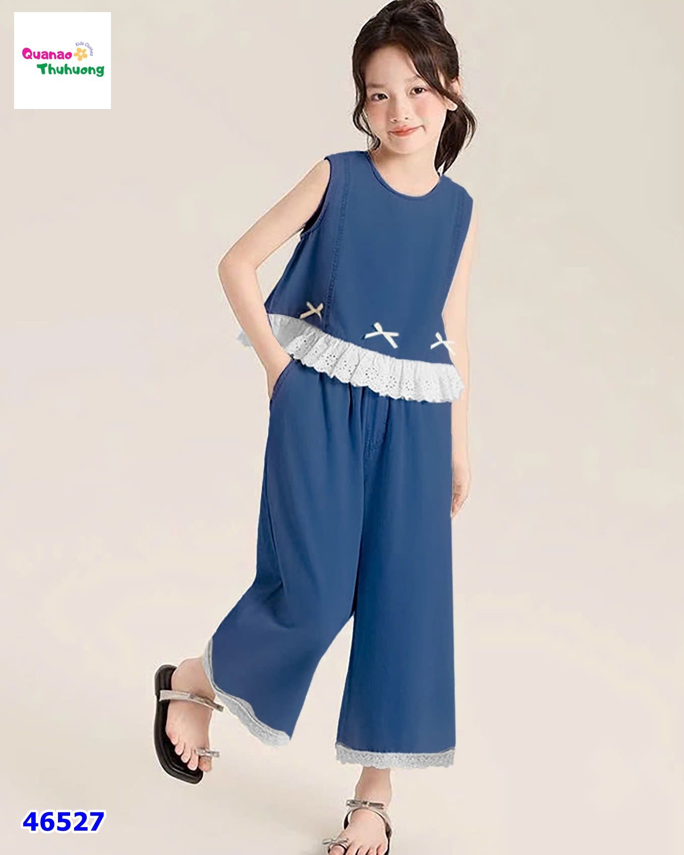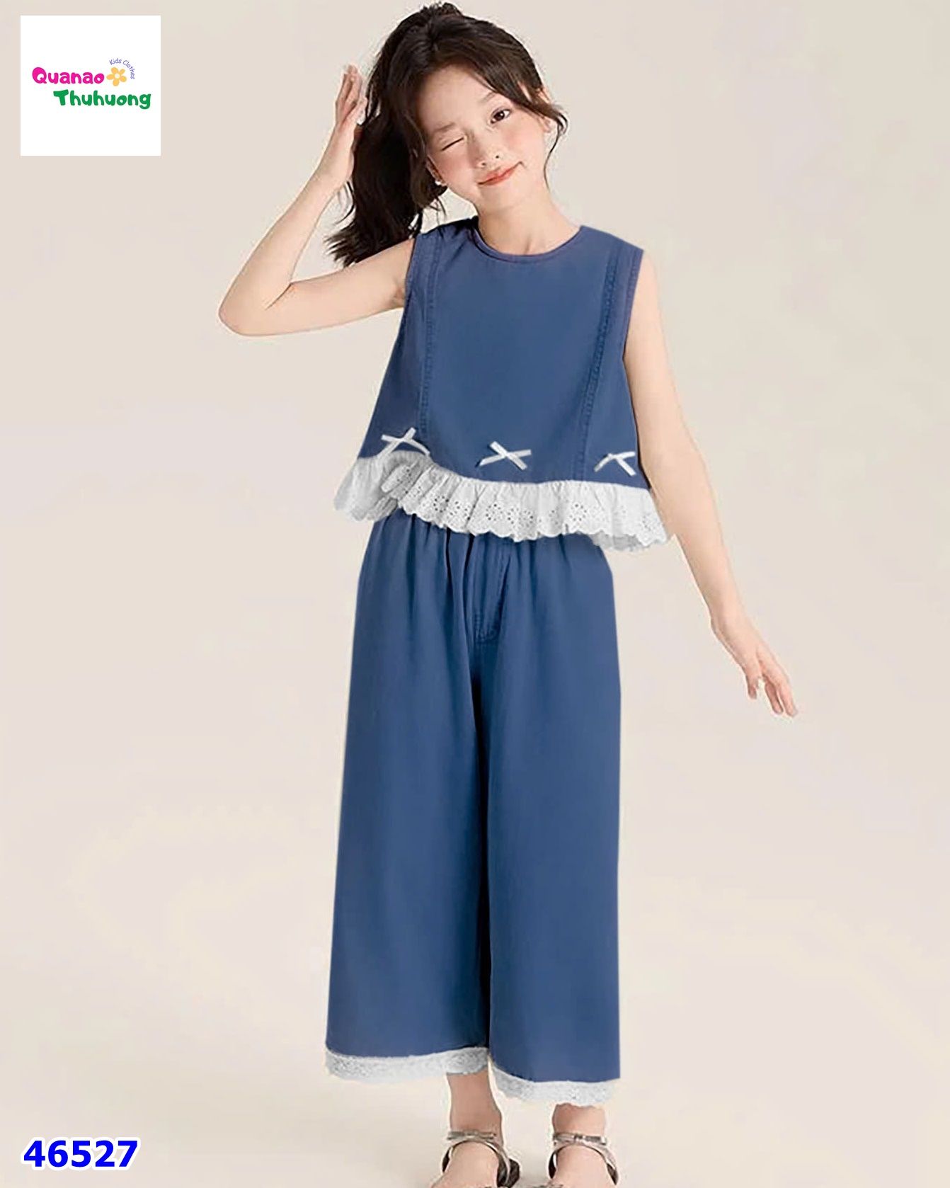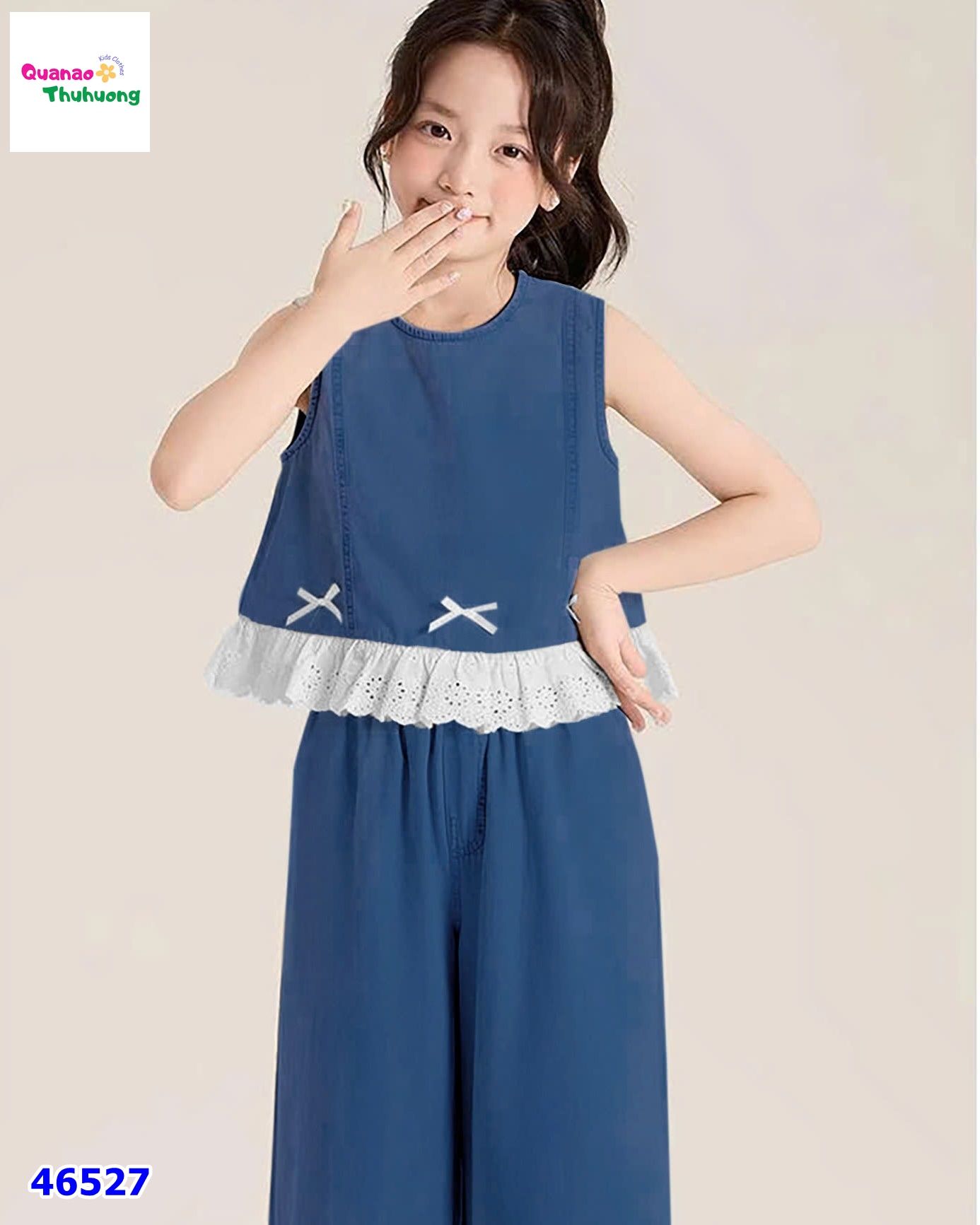 - Thiết kế kiểu dáng áo form xòe đính nơ, mix quần ống suông (9 tấc) viền ren tinh tế.