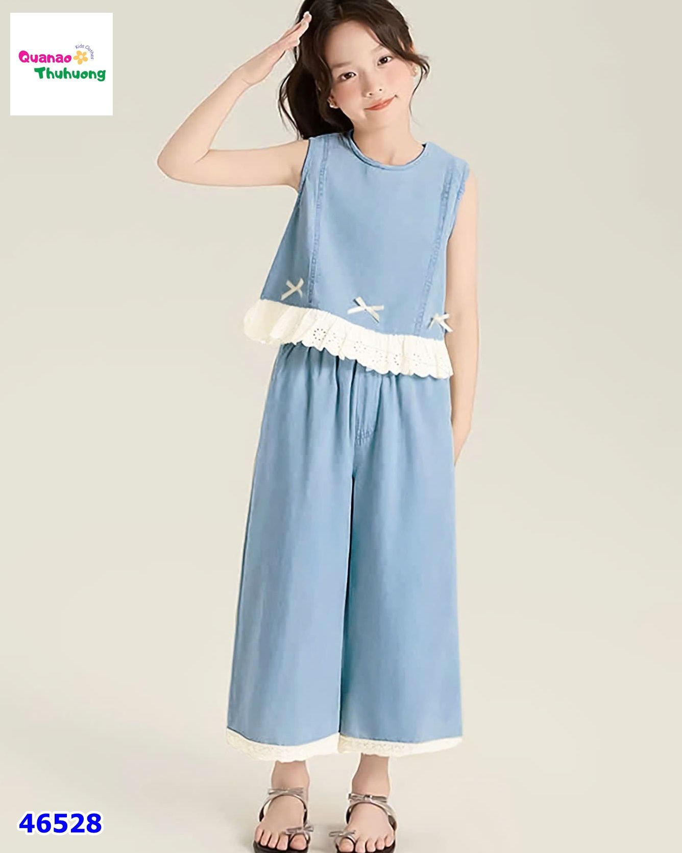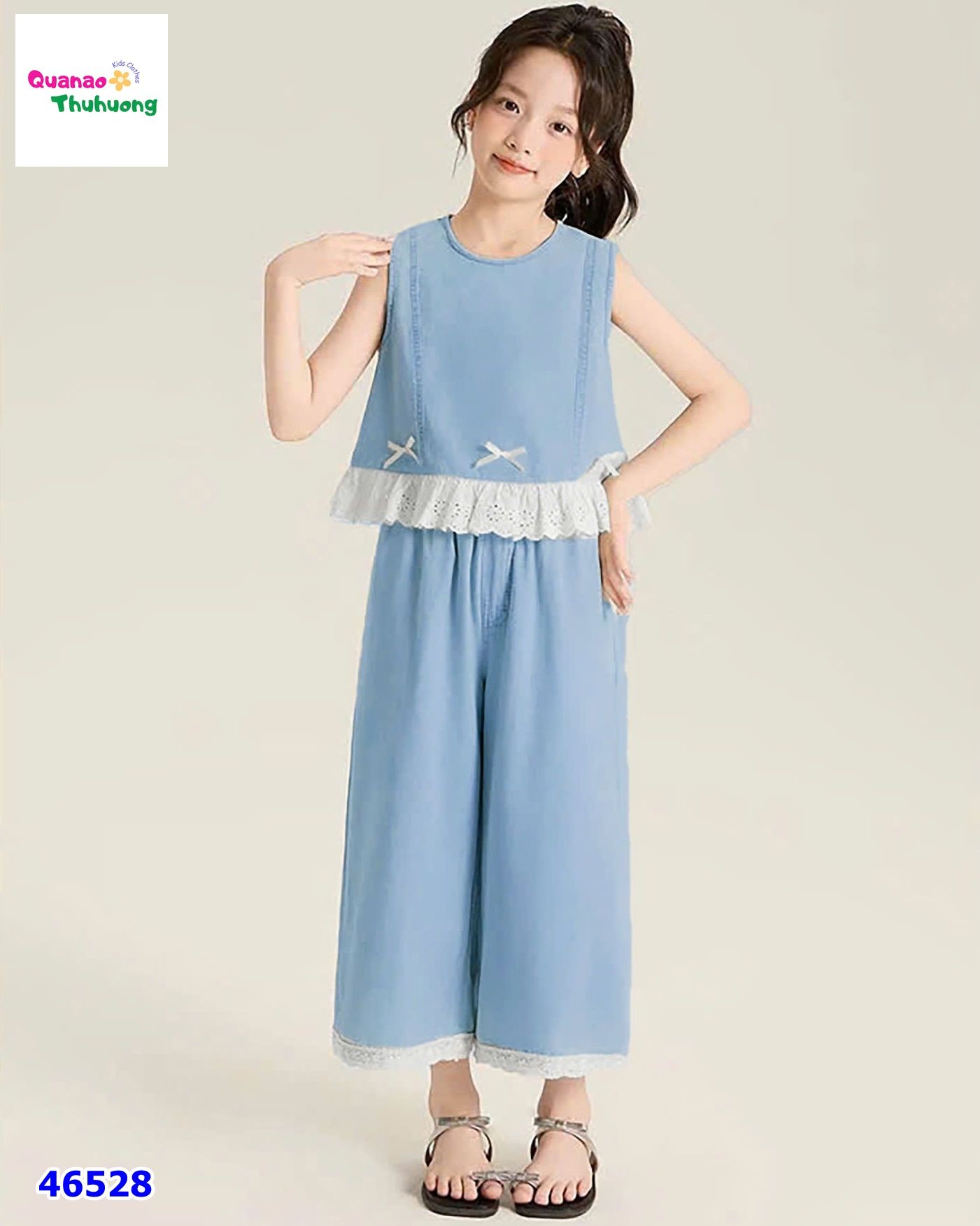 - Thiết kế kiểu dáng áo form xòe đính nơ, mix quần ống suông (9 tấc) viền ren tinh tế.