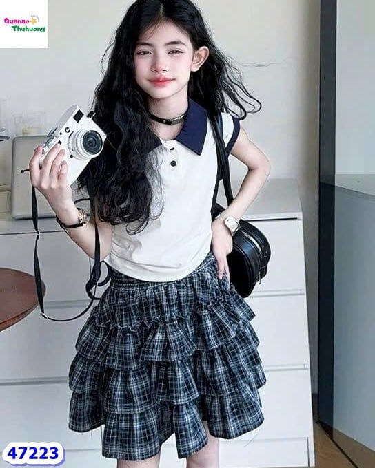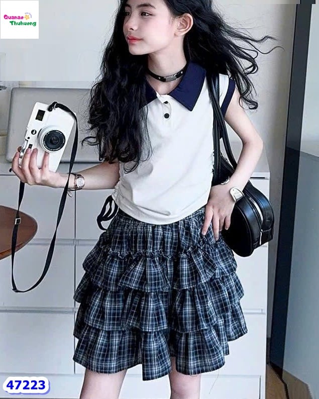 👉 Chân váy caro xanh 3 tầng bồng bềnh. Bé bào cũng mê.