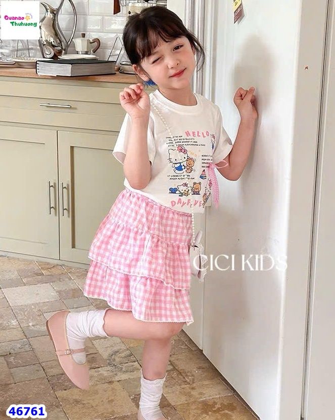 - Chân váy caro xếp tầng bồng bềnh, với hai lựa chọn xanh pastel và hồng dịu dàng.