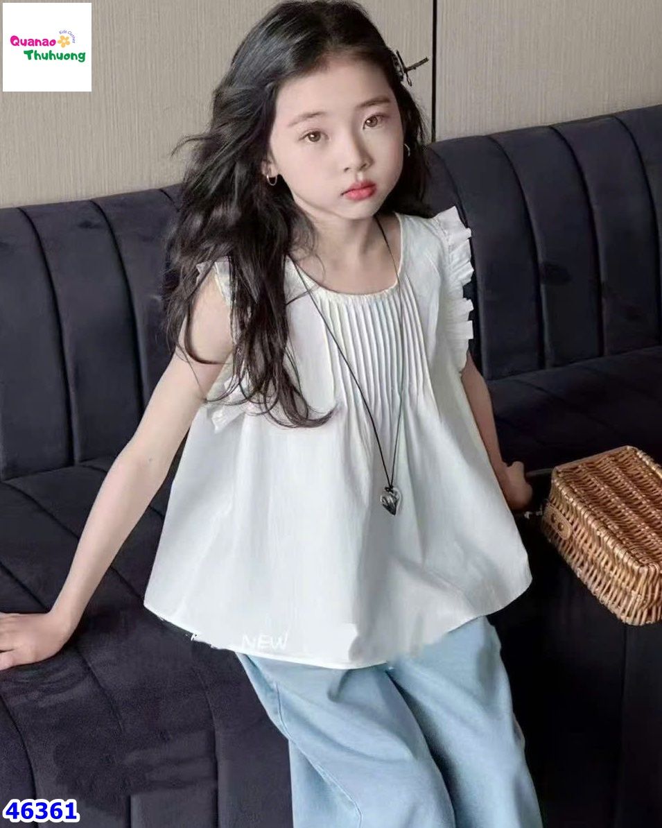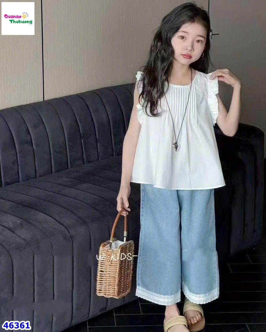 - Áo trắng chất thô mát rượi, phối cánh tiên điệu đà cho bé, kết hợp cùng quần jeans dài với điểm nhấn đường ren mềm mại.