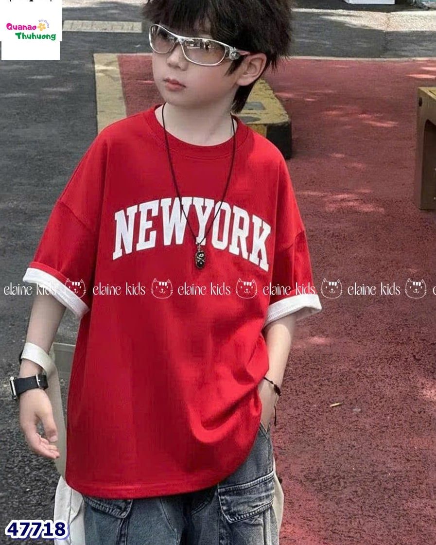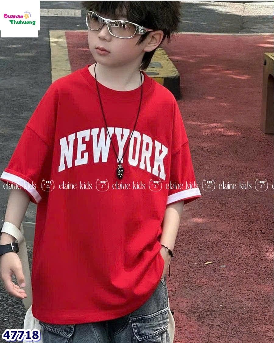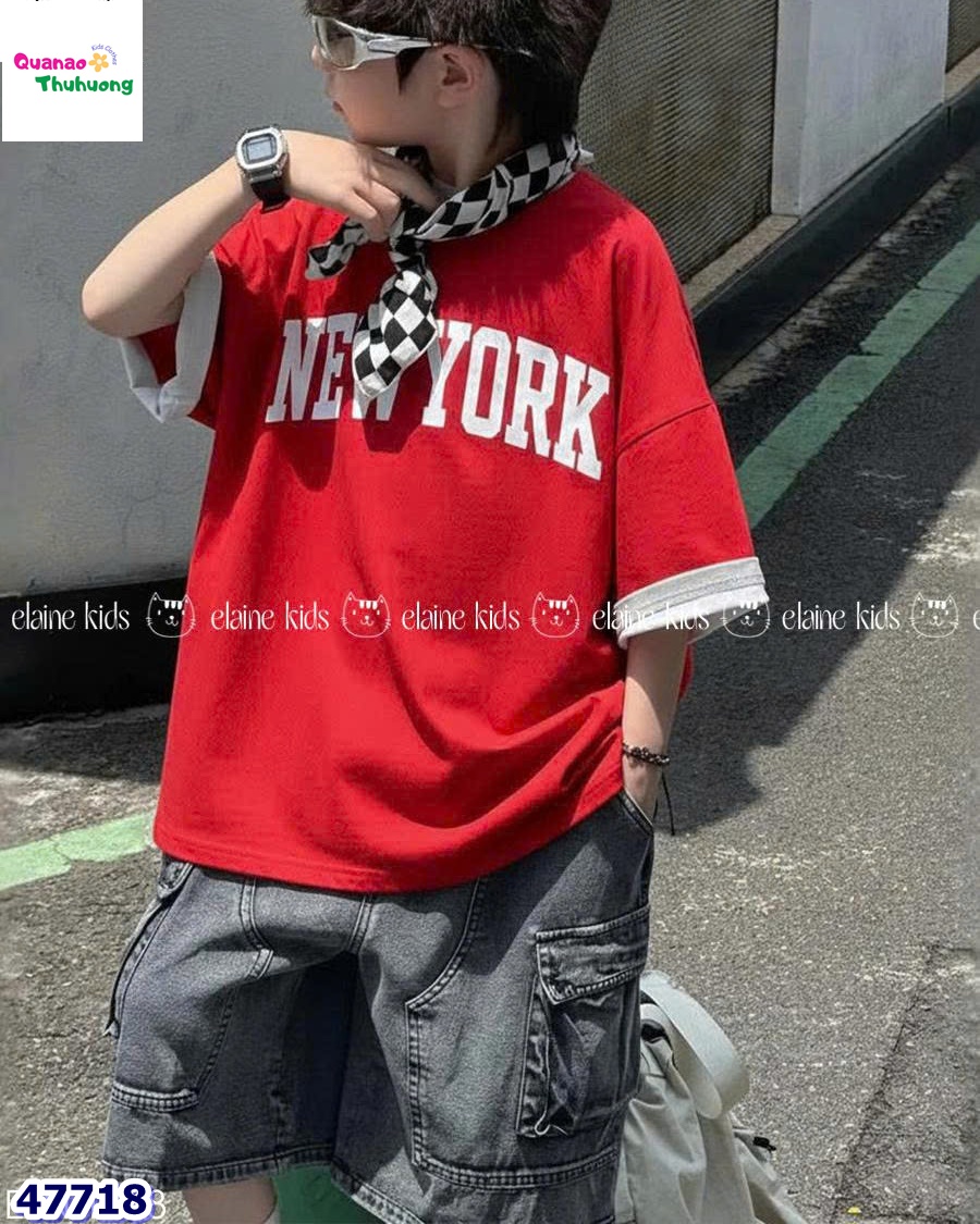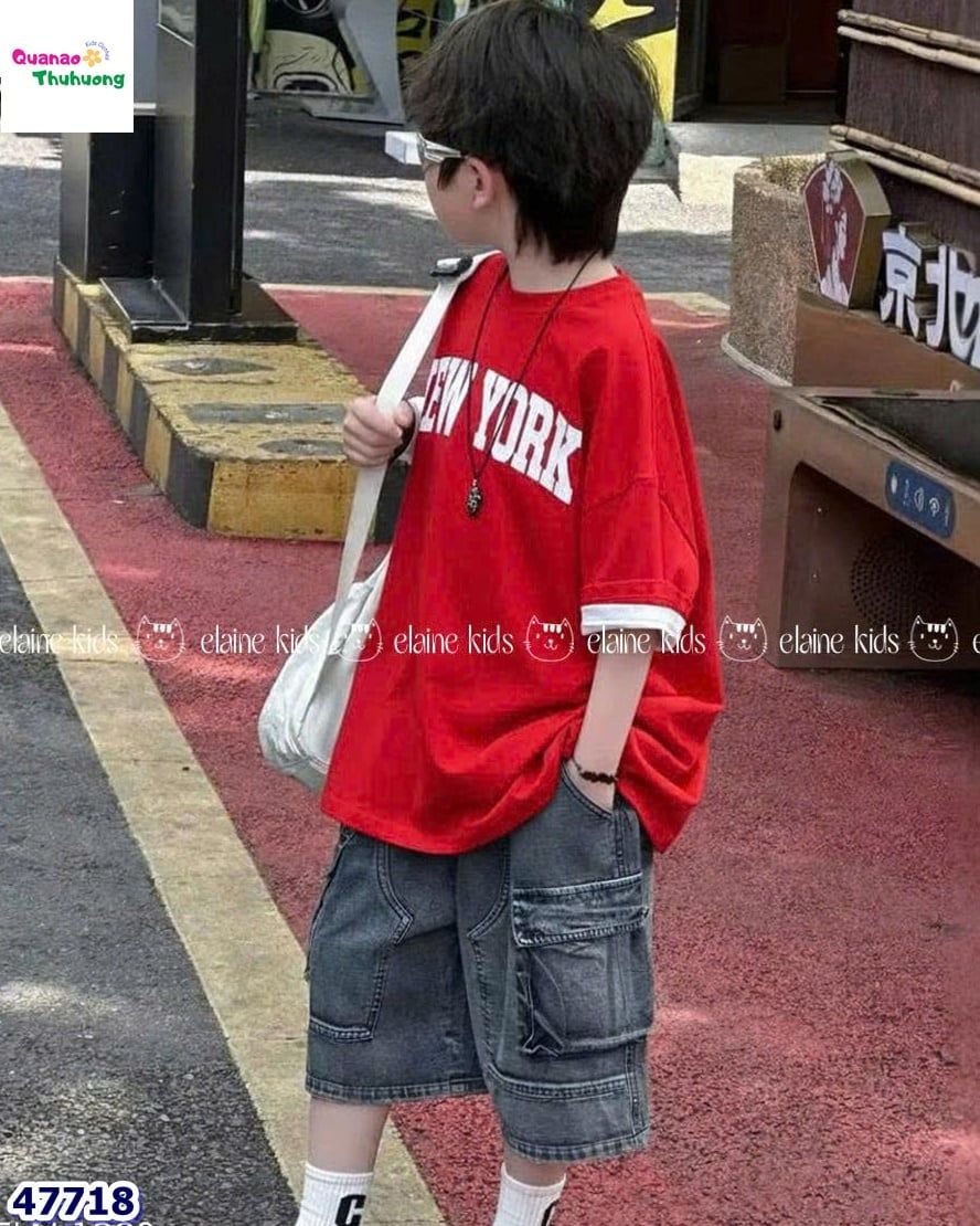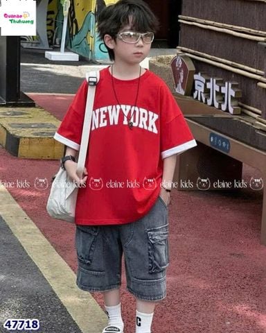 Bộ Elaine tông đỏ tươi rực rỡ, áo thun in chữ New York cá tính, phối cùng quần short/đùi đồng bộ tạo tổng thể khỏe khoắn, năng động.
