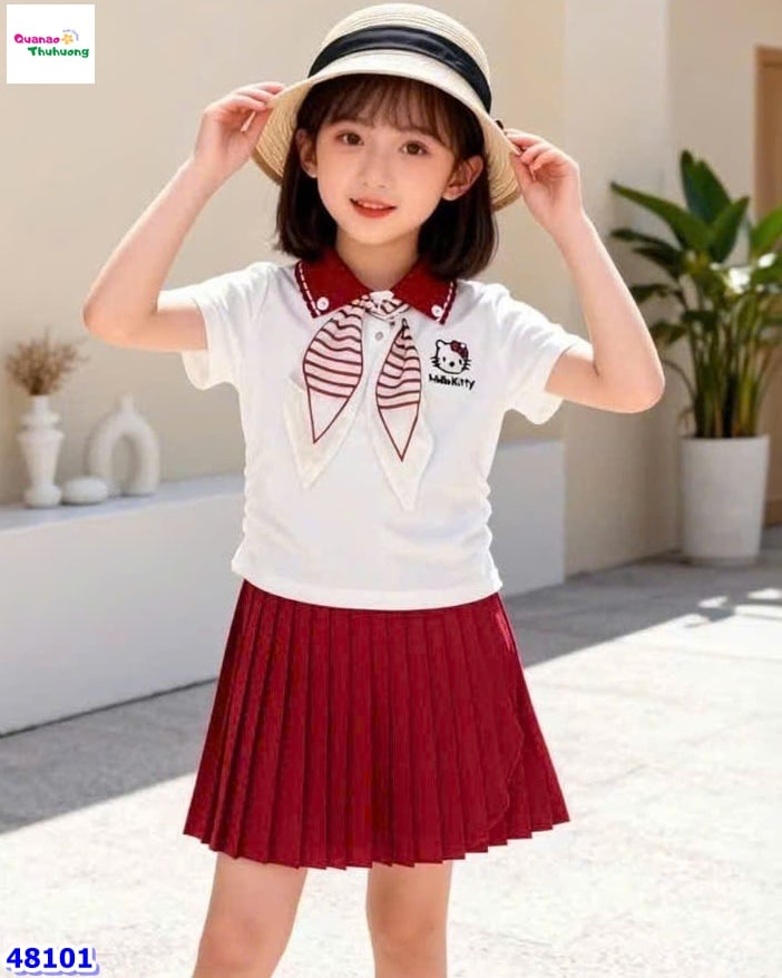 Set NYY áo trắng Kitty, váy xếp ly – mô tả