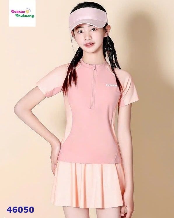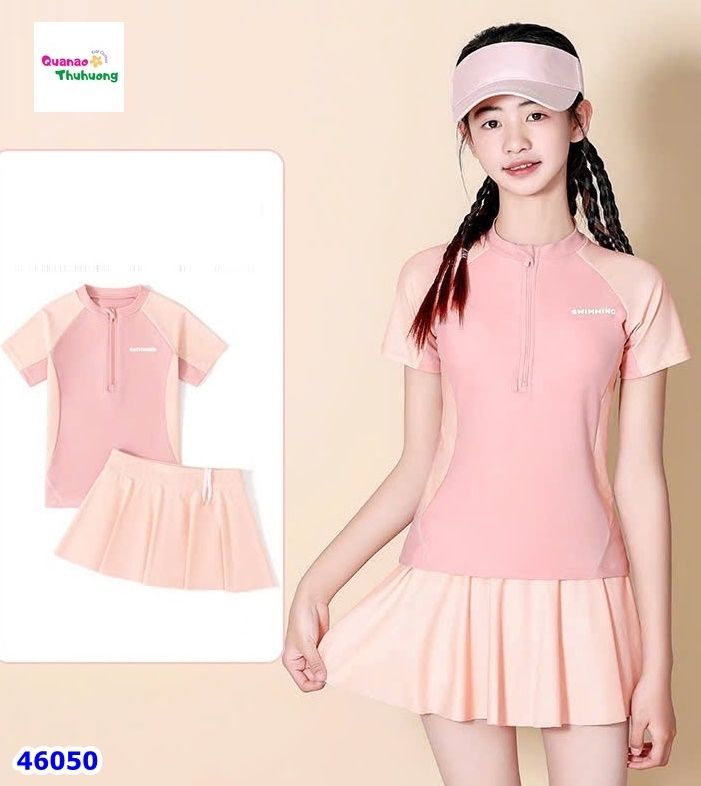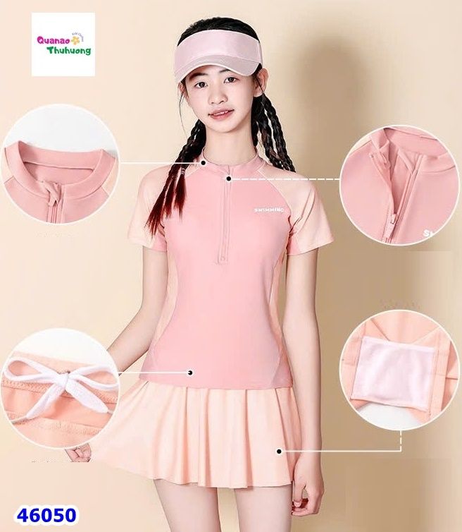 - Đồ bơi áo phối chân váy xòe nhẹ, màu hồng ngọt ngào, tôn lên vẻ đáng yêu và nữ tính