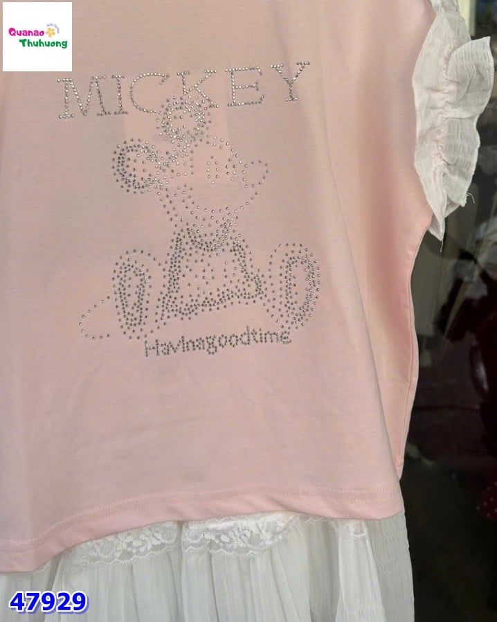 Áo hồng in hình Mickey nổi bật, phối cùng váy DDH xinh xắn, phong cách đáng yêu.