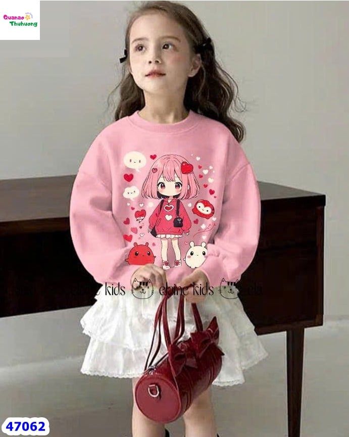 -Set áo nỉ da cá hồng hình cô gái mix chân váy trắng 3 tầng phối ren tầng tiểu thư 🤩🥰