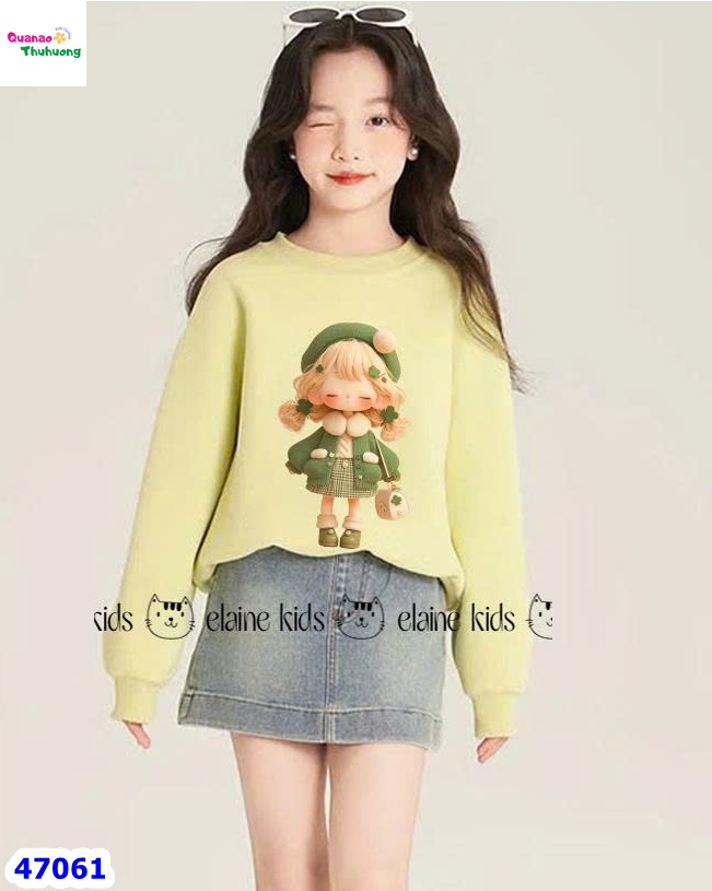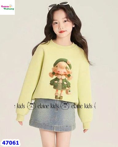 Set áo nỉ da cá màu cốm hình cô gái mix cùng chân váy Jeans xanh mềm
