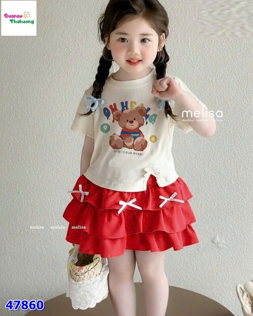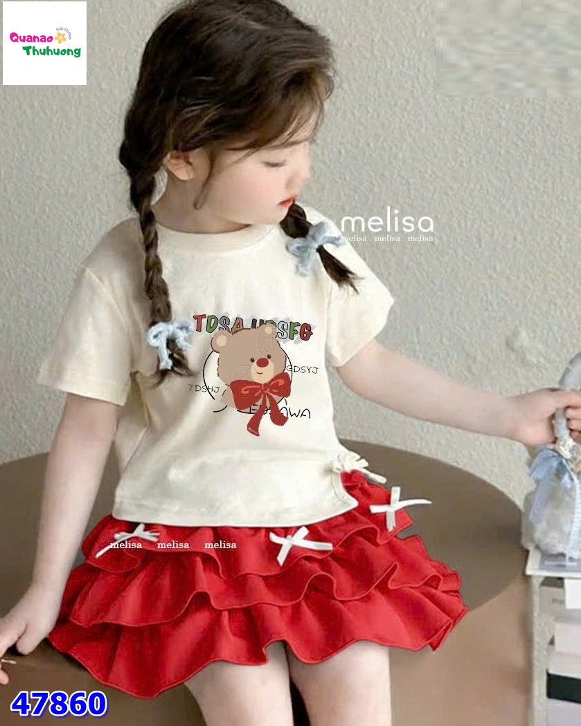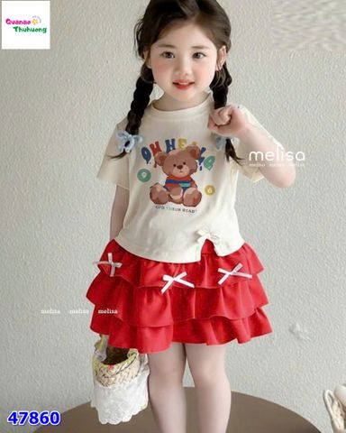 Kết hợp cùng chân váy đỏ tầng bèo xòe nhẹ, đính nơ xinh xắn giúp tổng thể thêm phần điệu đà