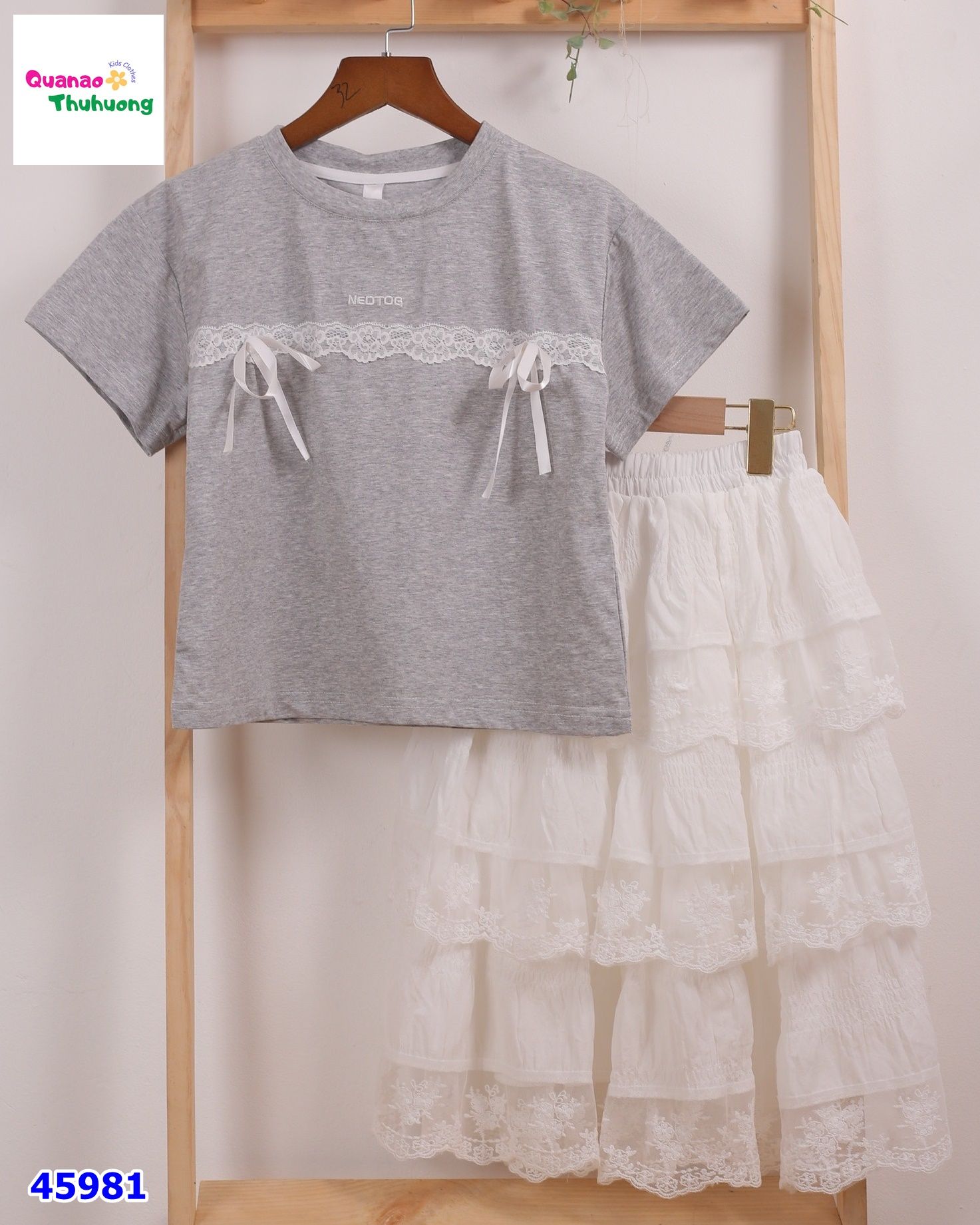 Set váy xám ren nơ